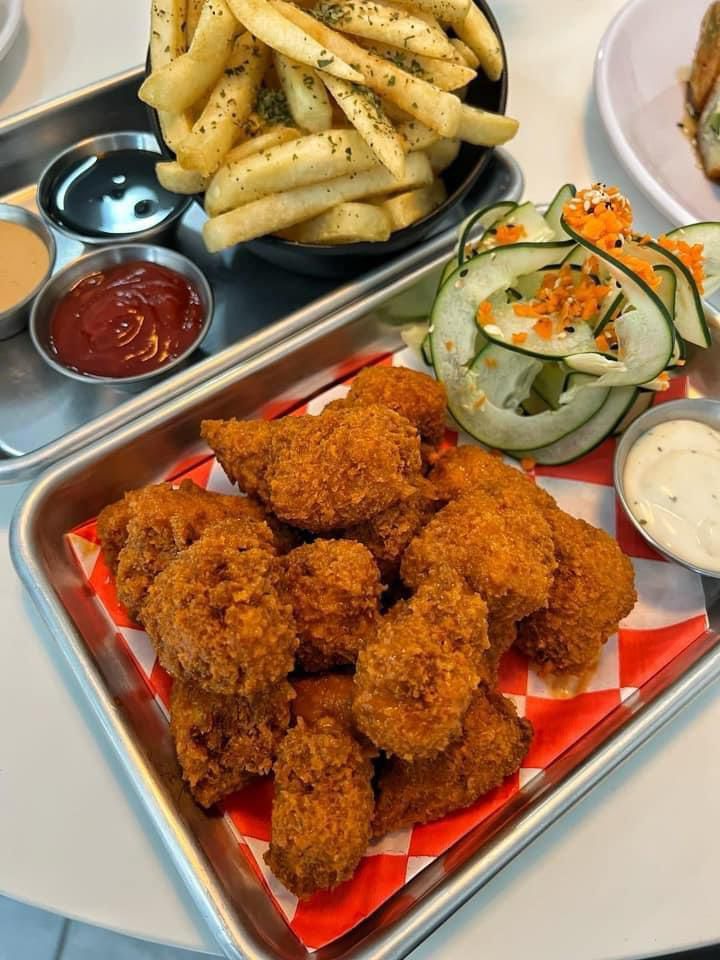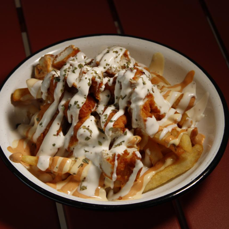 Papas fritas 300 gr, pechuga frita trozada 150 gr, aderezo de la casa o chipotle, aderezo ranch