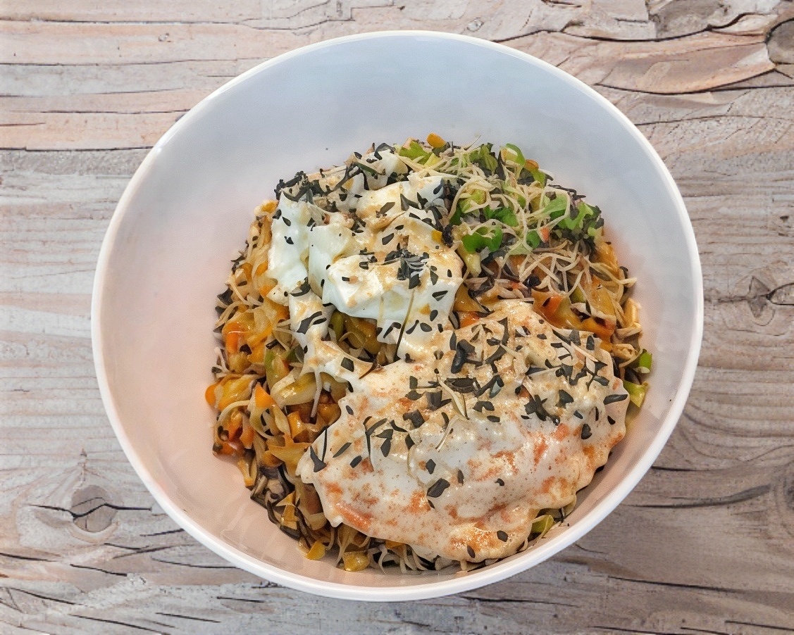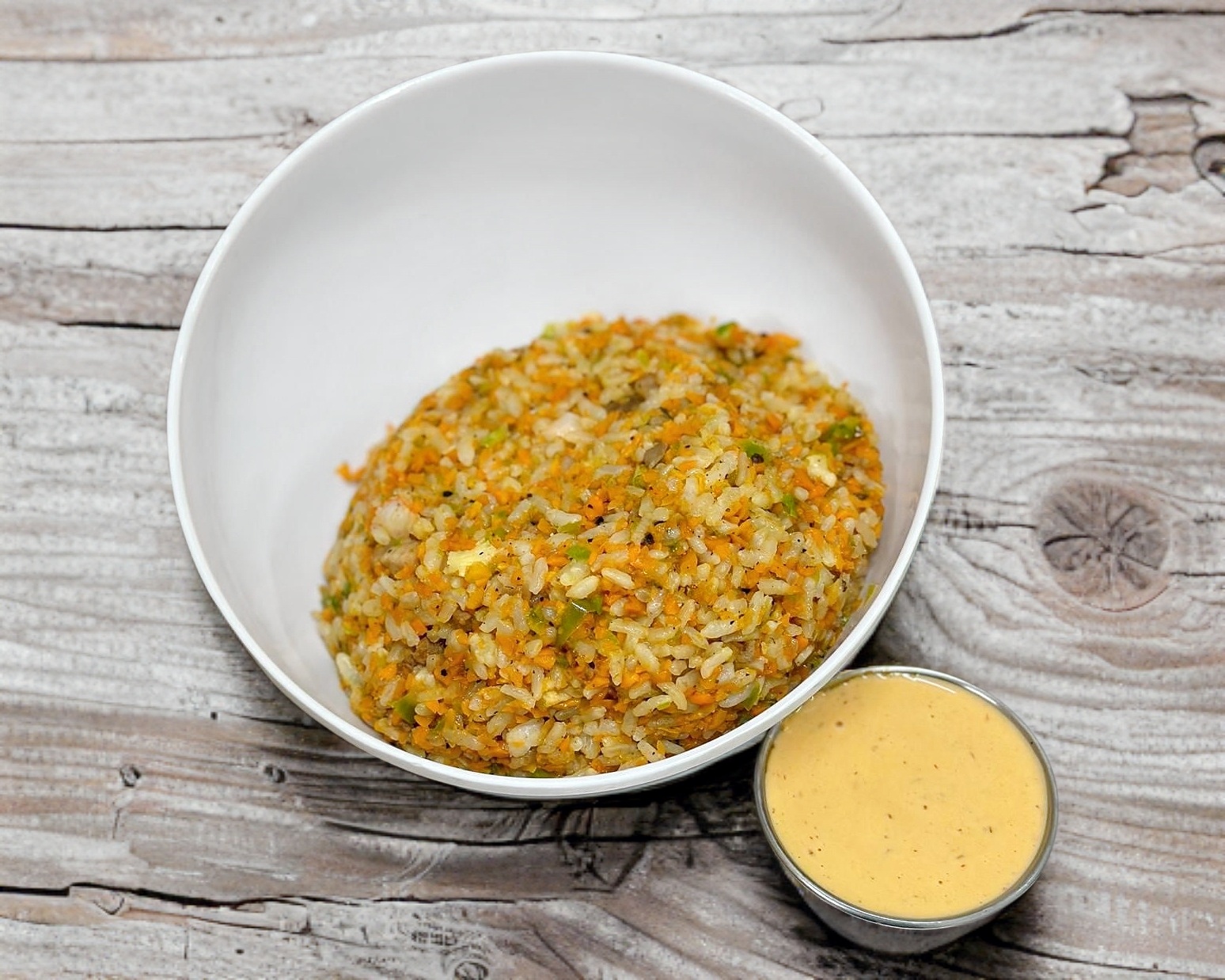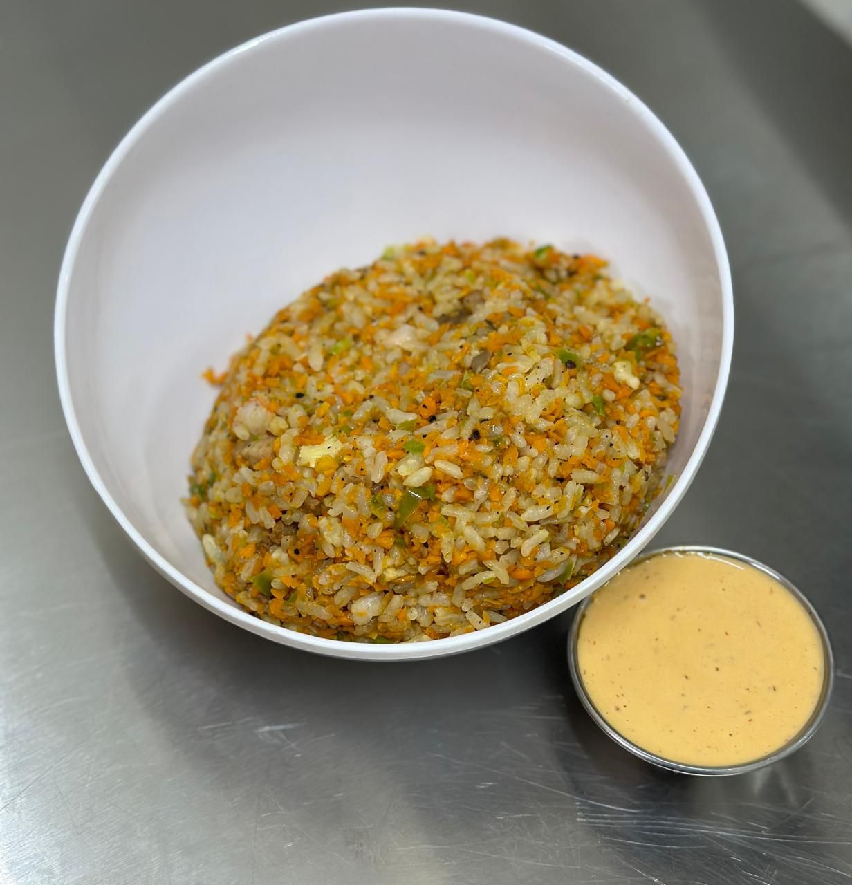 Arroz frito mixto y le agregamos pasta tampico, aguacate, queso crema y ajonjoli tostado.