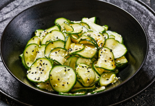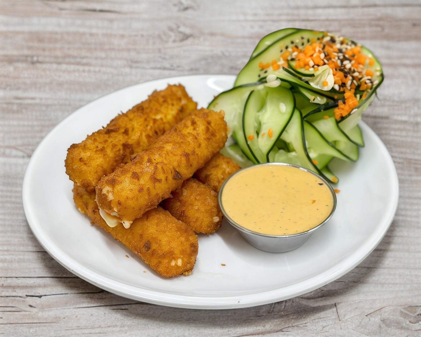 Bastoncitos de queso manchego, empanizado, acompañado de sunomono, ensalada de pepino, zanahoria y un toque de ajonjoli tostado.
