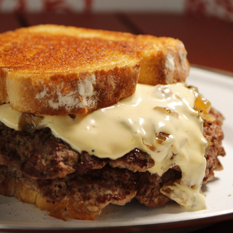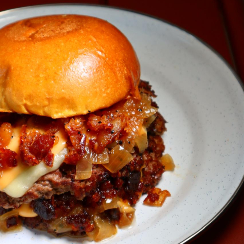 Pan, carne, queso americano, queso monterrey jack, cebolla caramelizada, tocino (mermelada), aderezo de la casa