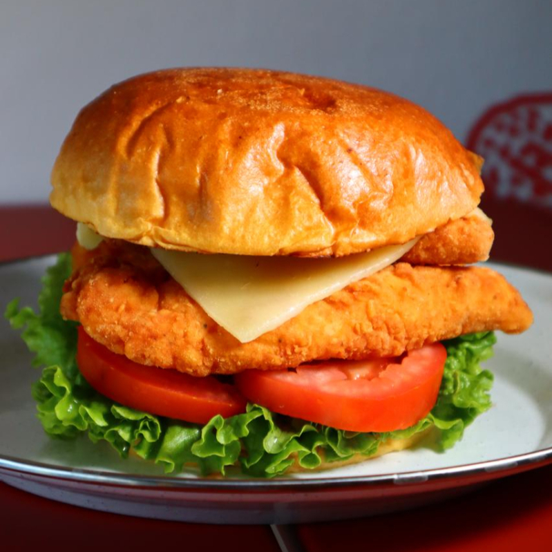 Pan, pechuga crispy, queso monterrey jack, lechuga, tomate, aderezo de la casa