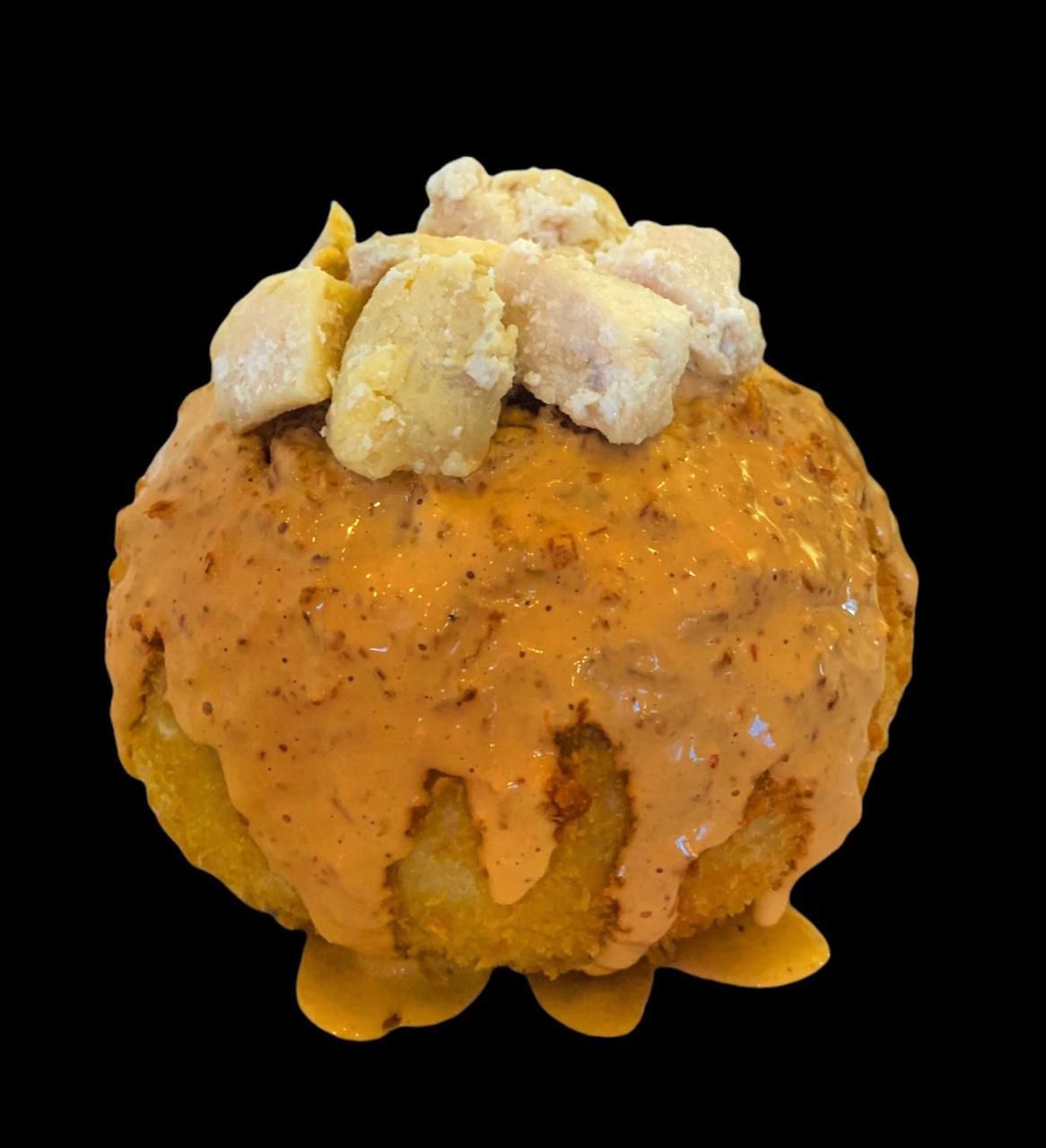 Bola de arroz rellena de top sirloin, queso philadelphia, aguacate, bañada en nuestra salsa chipotle house, BBQ ó ranch, por encima deliciosos trocitos de tocino con un toque de queso parmesano.( 2 topping a eleccion)