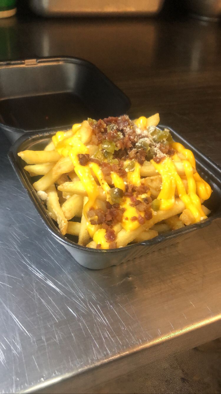 Papas a la francesa bañadas en delicioso queso cheddar, por encima trocitos, chilitos jalapeños y un toque de queso parmesano.