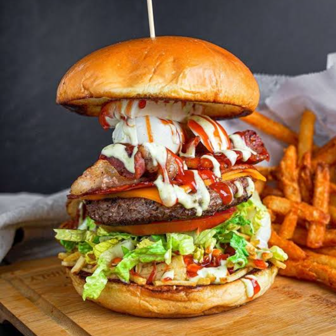 doble carne, doble queso ,doble jamon aguacate , 2 aros de cebolla ,acompañada de papas y aderezos