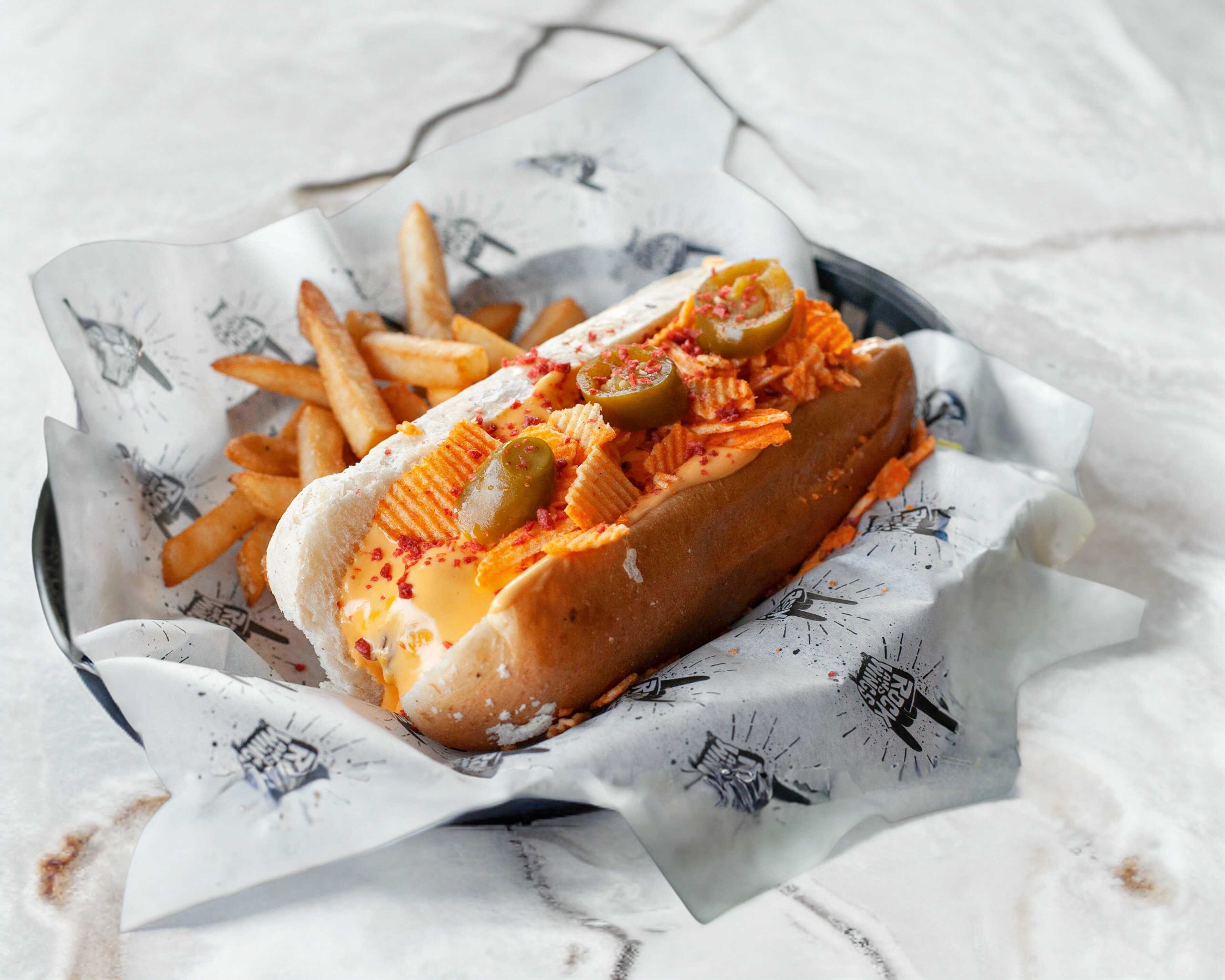 Salchicha grande, queso para nachos, ruffles, tocino deshidratado y jalapeños.