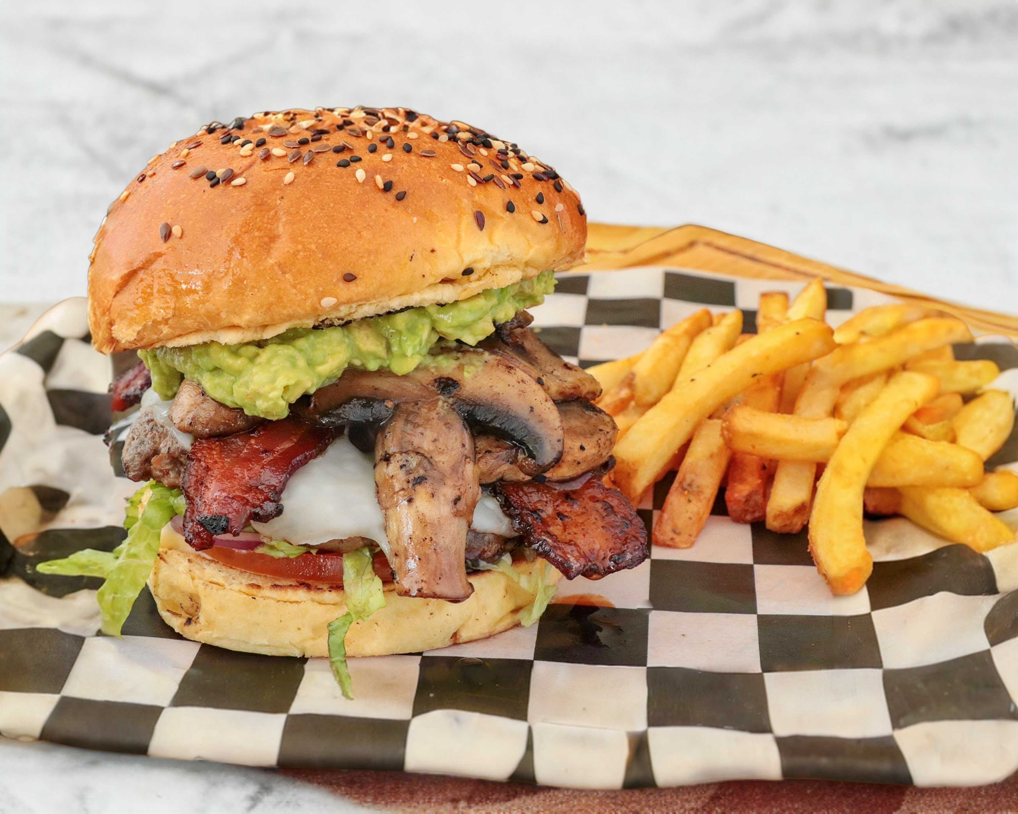 Pan artesanal, mezcla de lechugas, tomate, carne, queso, champiñones, tocino, guacamole y mayonesa.