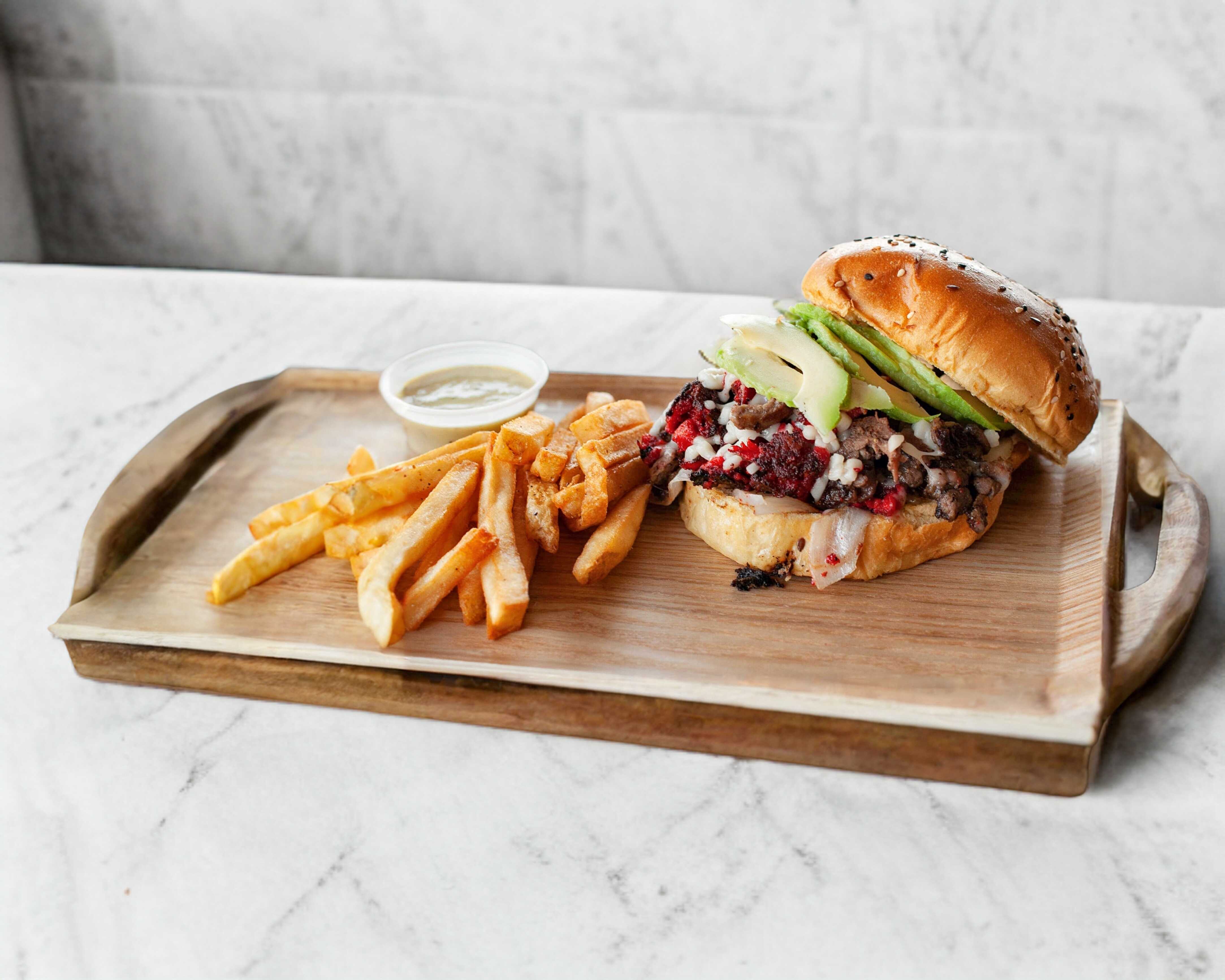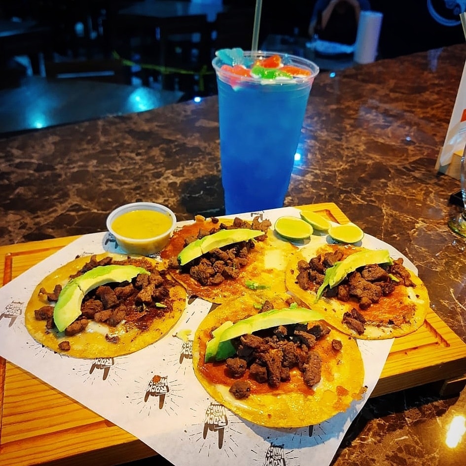 Pan artesanal, cebolla asada, trompo y rib-eye, queso, cebolla, cilantro y aguacate.