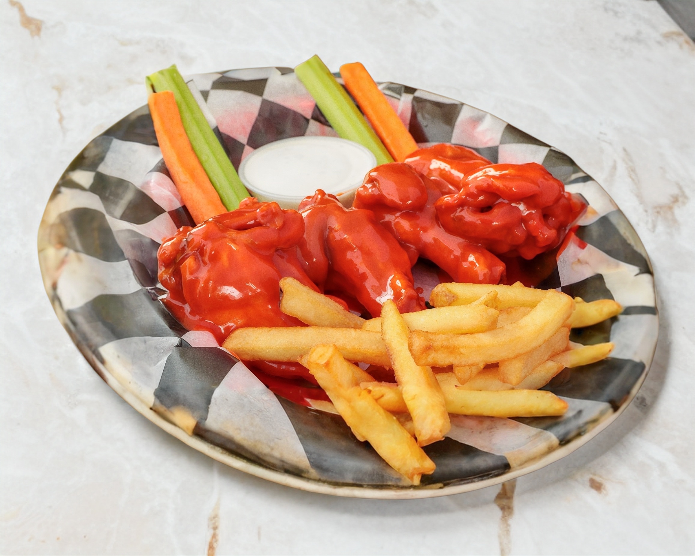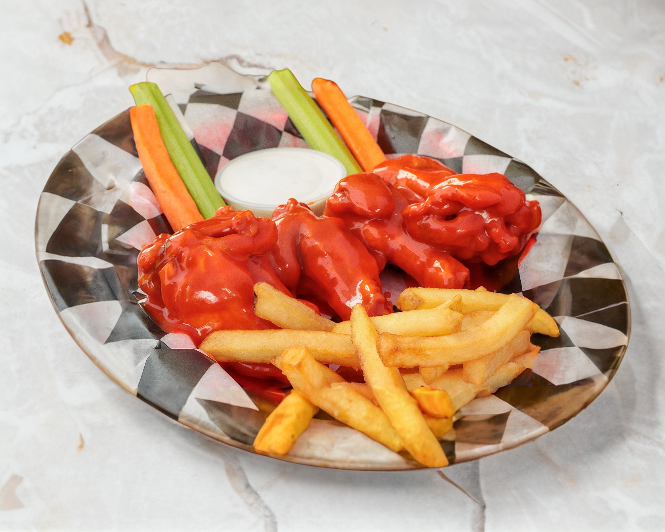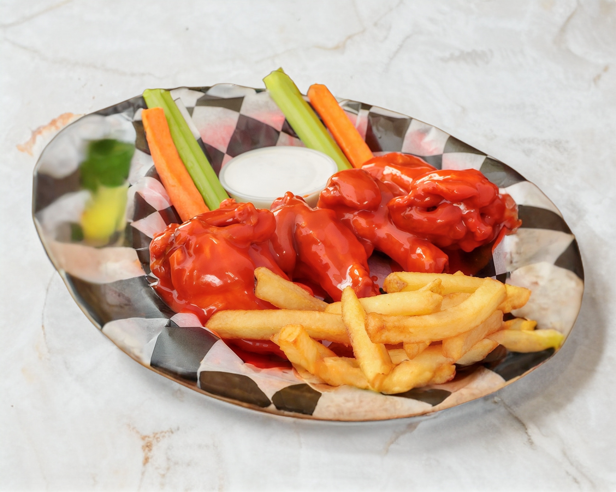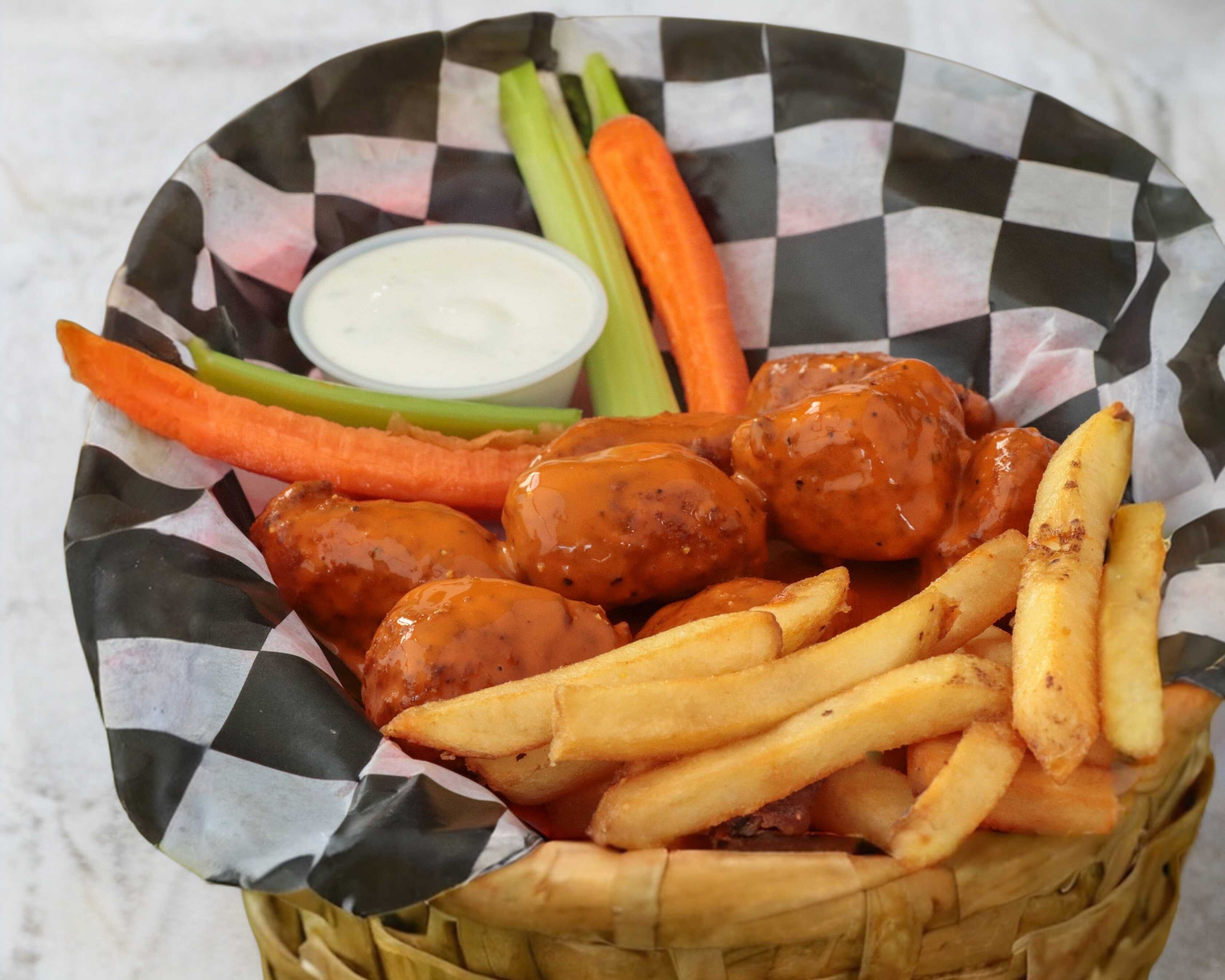 600gr Alitas bañadas en tu salsa favorita, inluyen papas, aderezo y verdura.