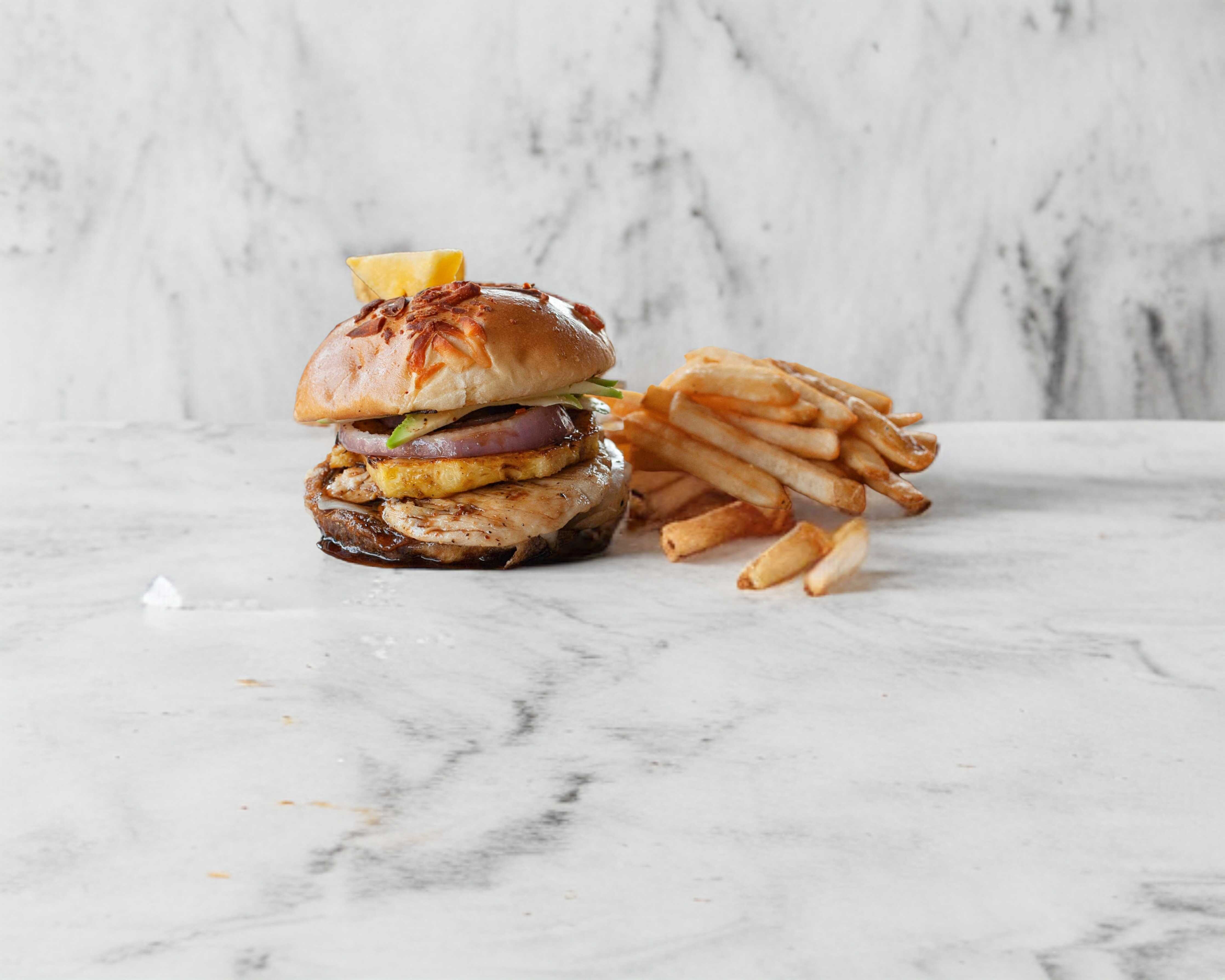 Pan artesanal de queso, queso manchego, pollo teriyaki, cebolla caramelizada, piña y guacamole.