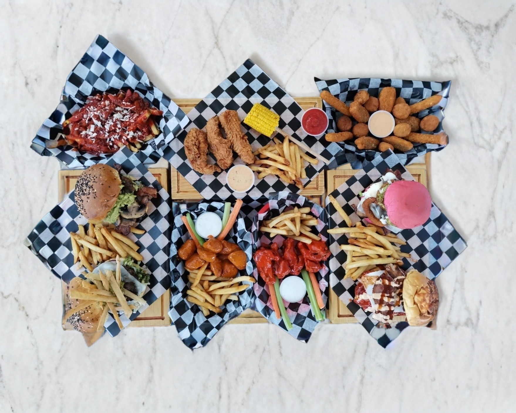 Pan rosa, mezcla de cebolla, y pimiento rojo, mezcla de lechugas, carne, aderezo ranch, queso filadelphia, y manchego, tocino, aros de cebolla empanizados y guacamole.