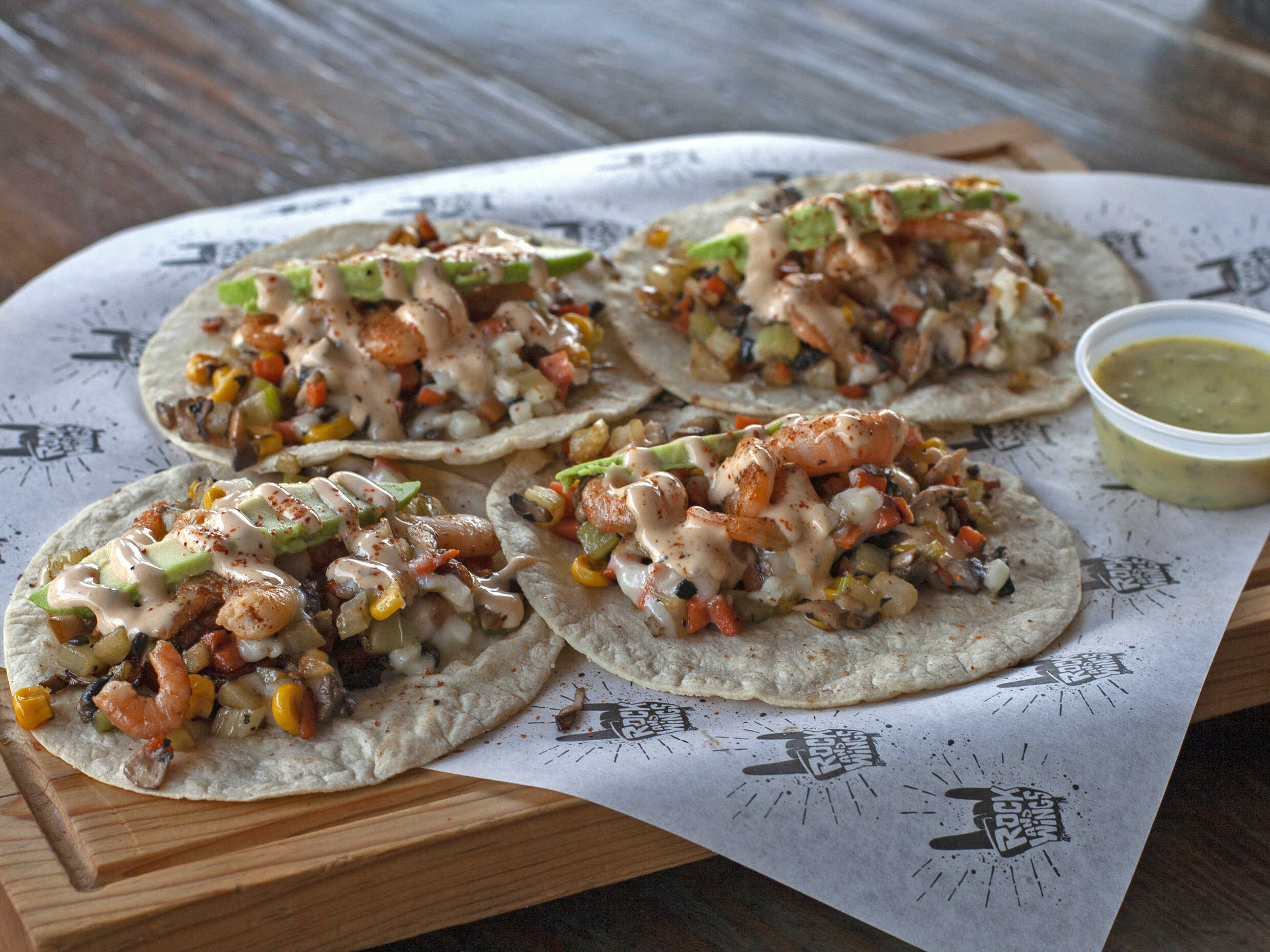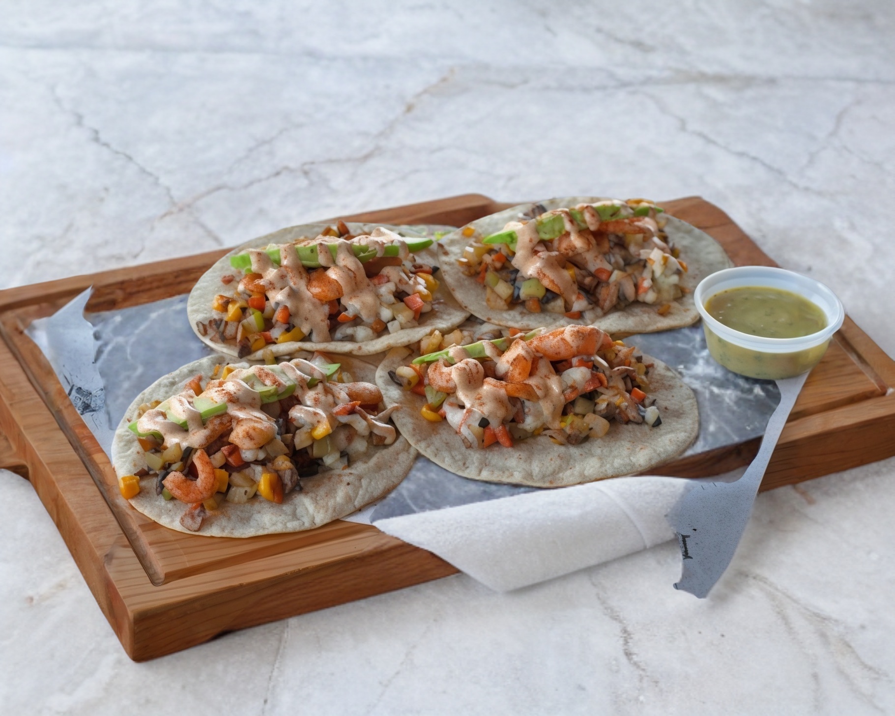 4 Tacos en tortilla de maíz blanco con camarón, queso, mezcla de verduras y aderezo chipotle.