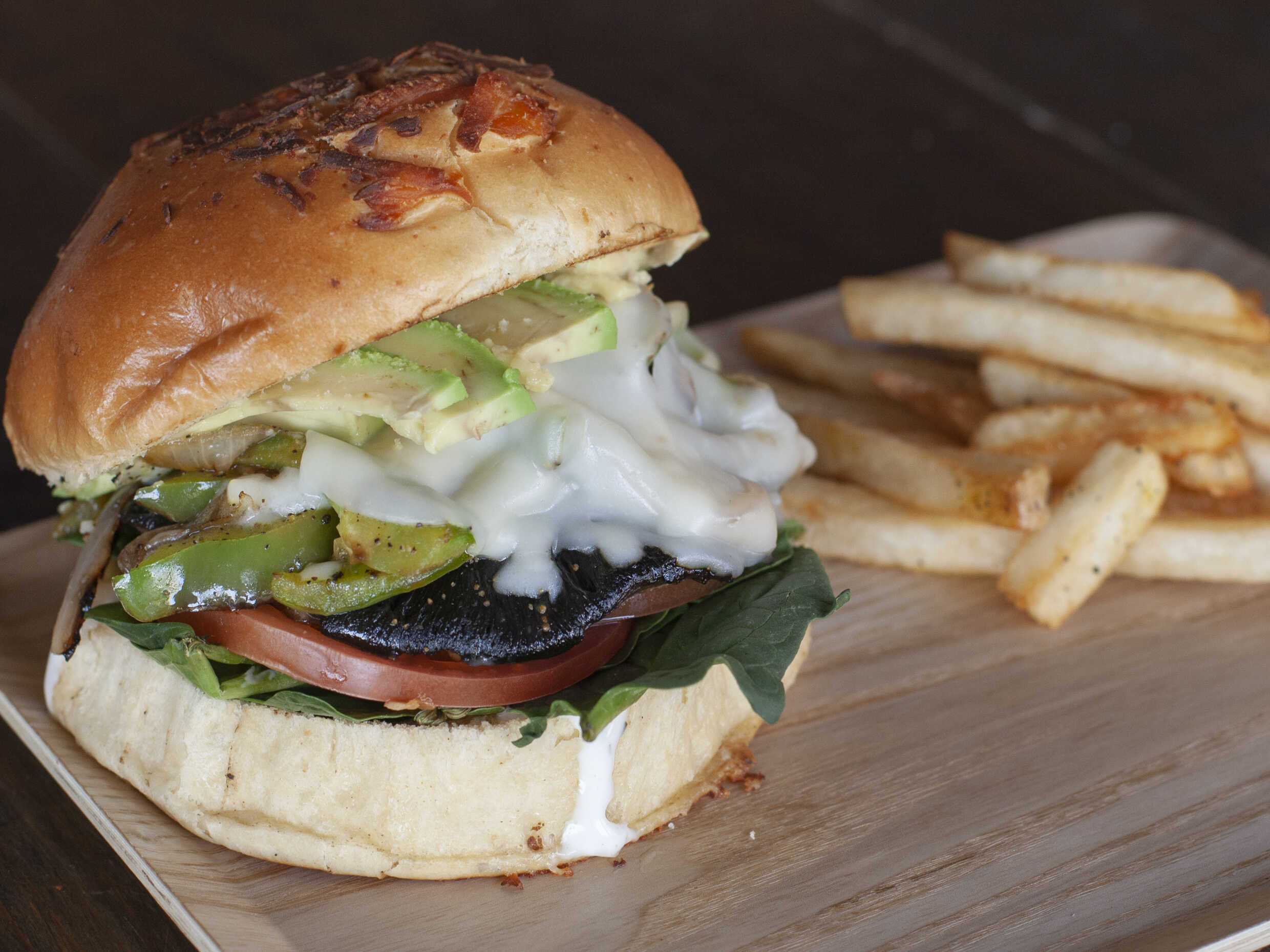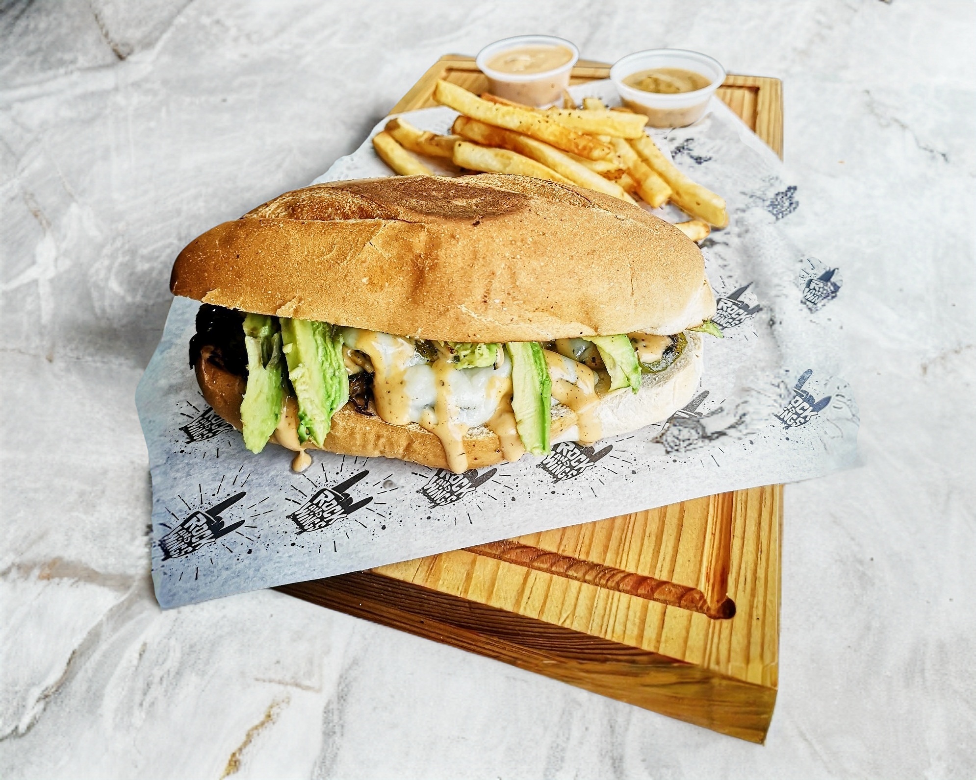 Pan artesanal de queso, aderezo ranch, espinaca, tomate,hongo portobello, mezcla de cebolla, pimiento rojo, queso manchego y aguacate.