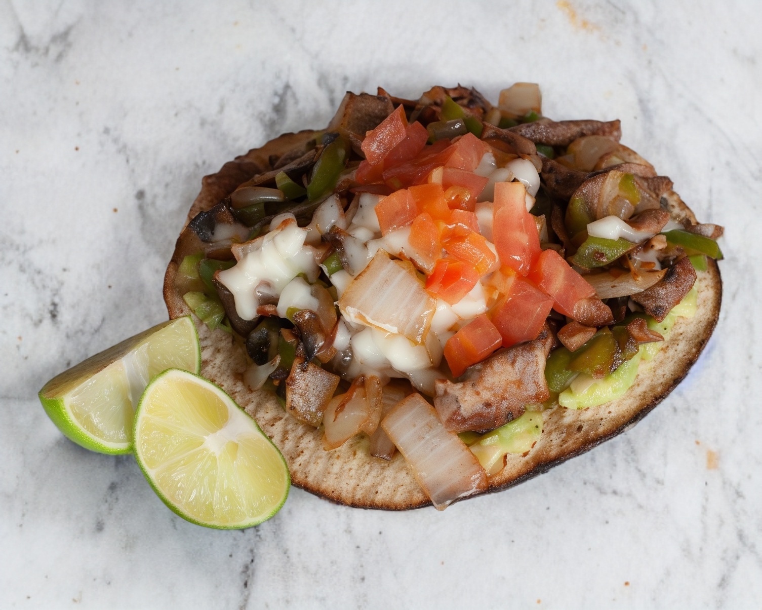 Carne de rib eye, morrón, cebolla, champiñón, tomate, guacamole y queso mozarella.