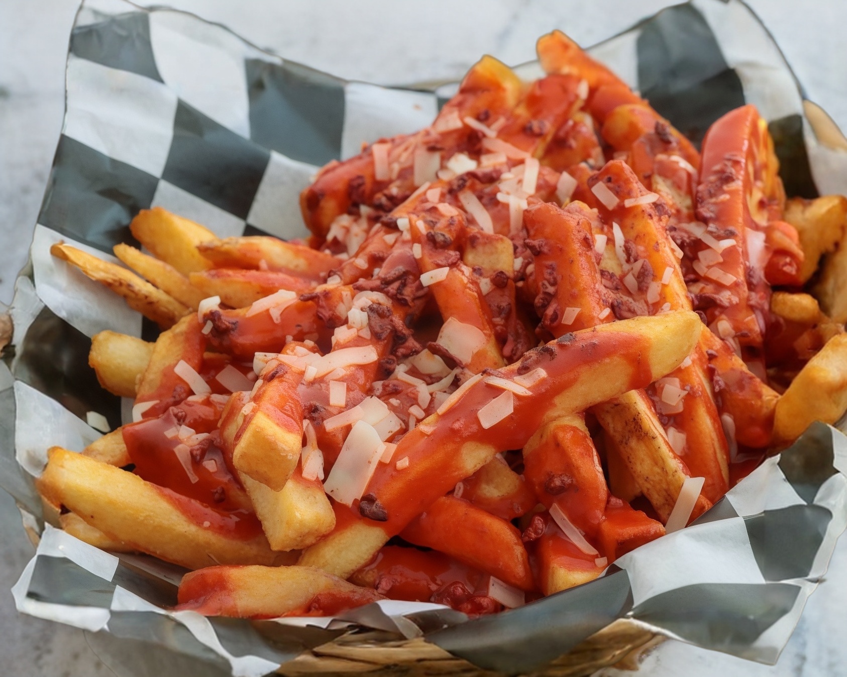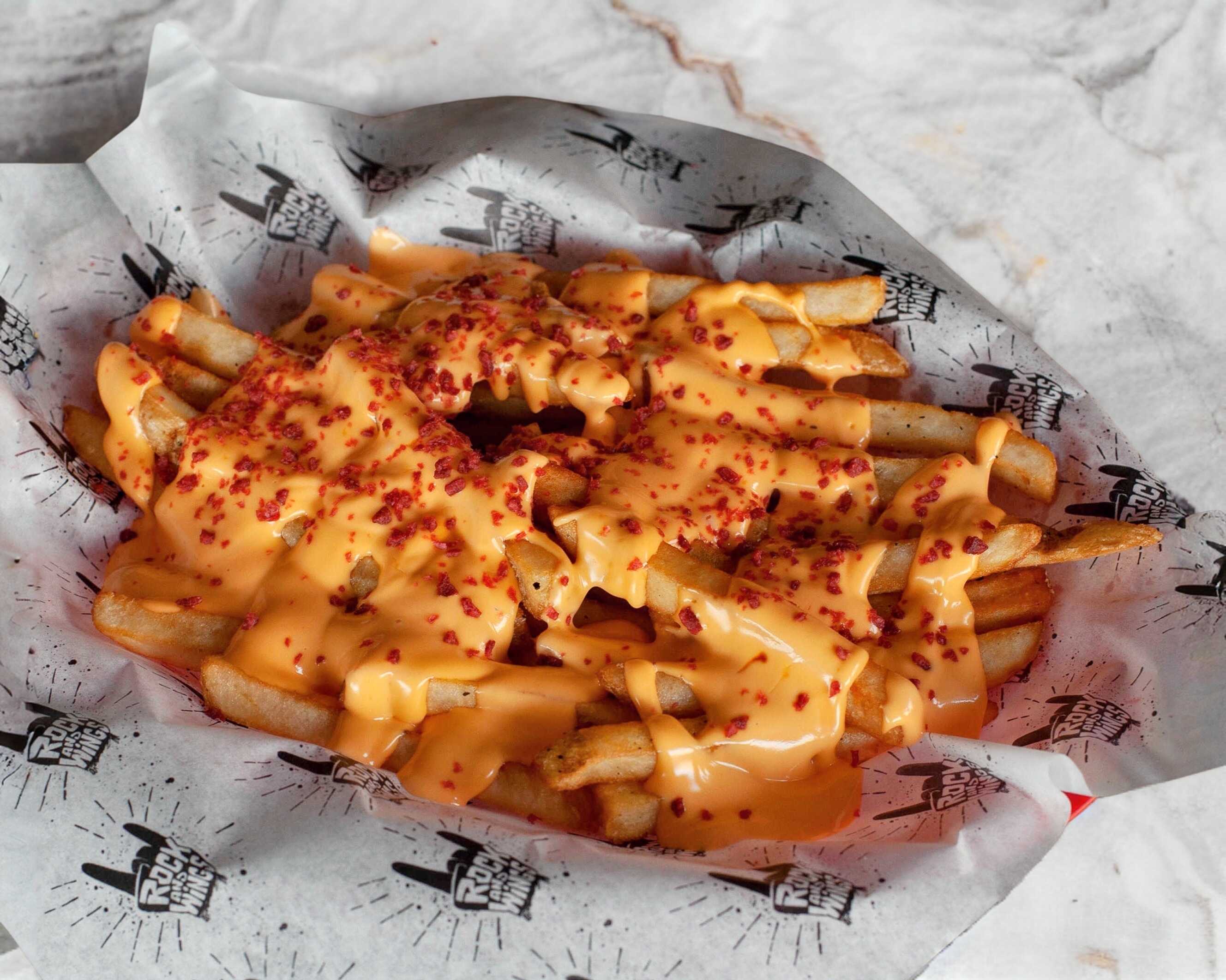 Papas bañadas en rock souce con queso y tocino.