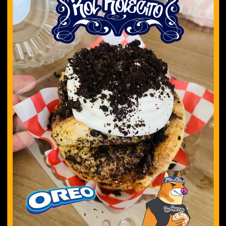 Rol de canela rellenovy cubierto con trozos crujientes de galleta Oreo y cobertura de queso crema que combina textura y dulzura irresistible.