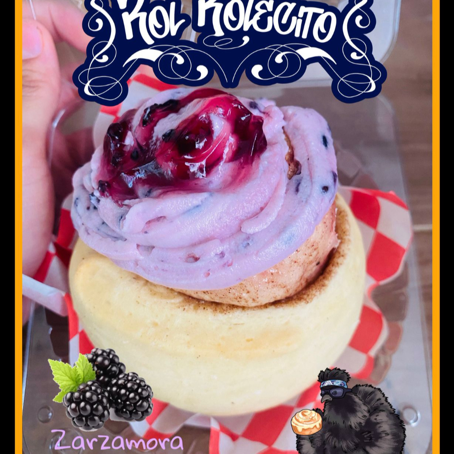 Rol de canela relleno de mermelada de zarzamora cubierto de nuestro delicioso betún de queso crema sabor zarzamora, equilibrio perfecto entre dulzura y ligero toque ácido frutal.