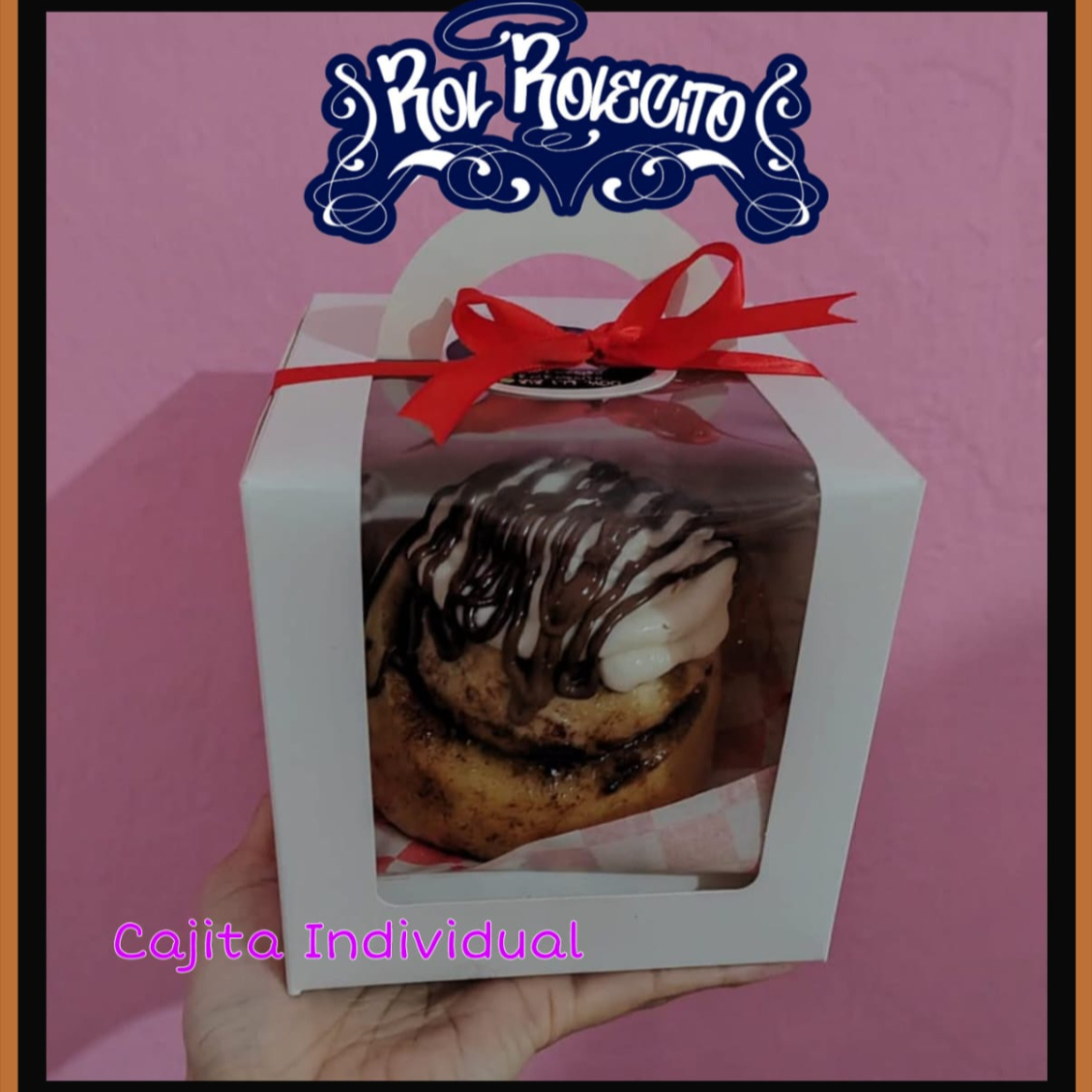Caja individual decorada con 1 rol de canela gourmet, perfecta para regalo personalizado o detalle especial.
