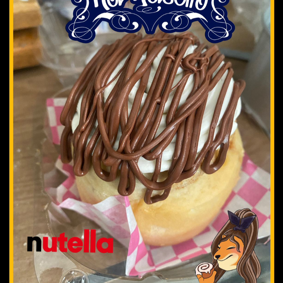 Delicioso rol de canela cubierto con nuestro betún de queso crema, relleno y cubierto de abundante Nutella, combinación perfecta de cacao y avellana con masa suave y recién horneada.