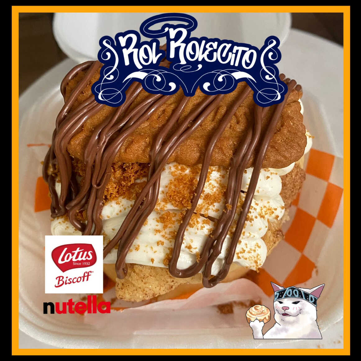 Rol de canela relleno de galletas Lotus y Nutella, cubierto con nuestro delicioso betún de queso crema, galletas y más Nutella