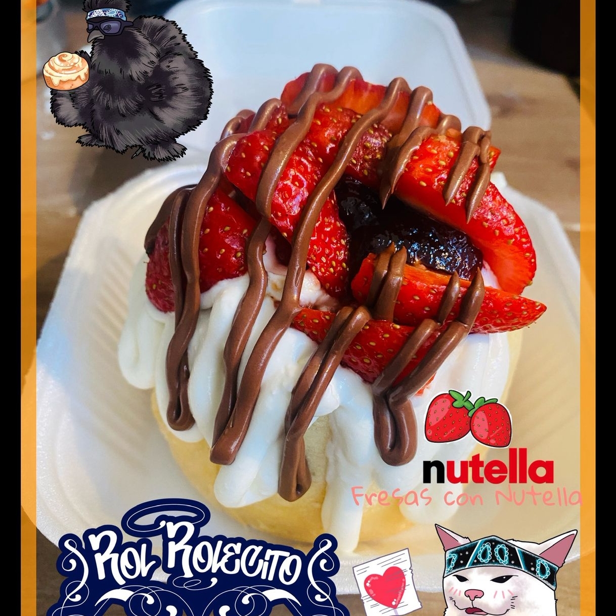 Rol de canela relleno de Nutella cubierto con nuestro delicioso betún de queso crema, trozos de fresa fresca y bañado de Nutella
