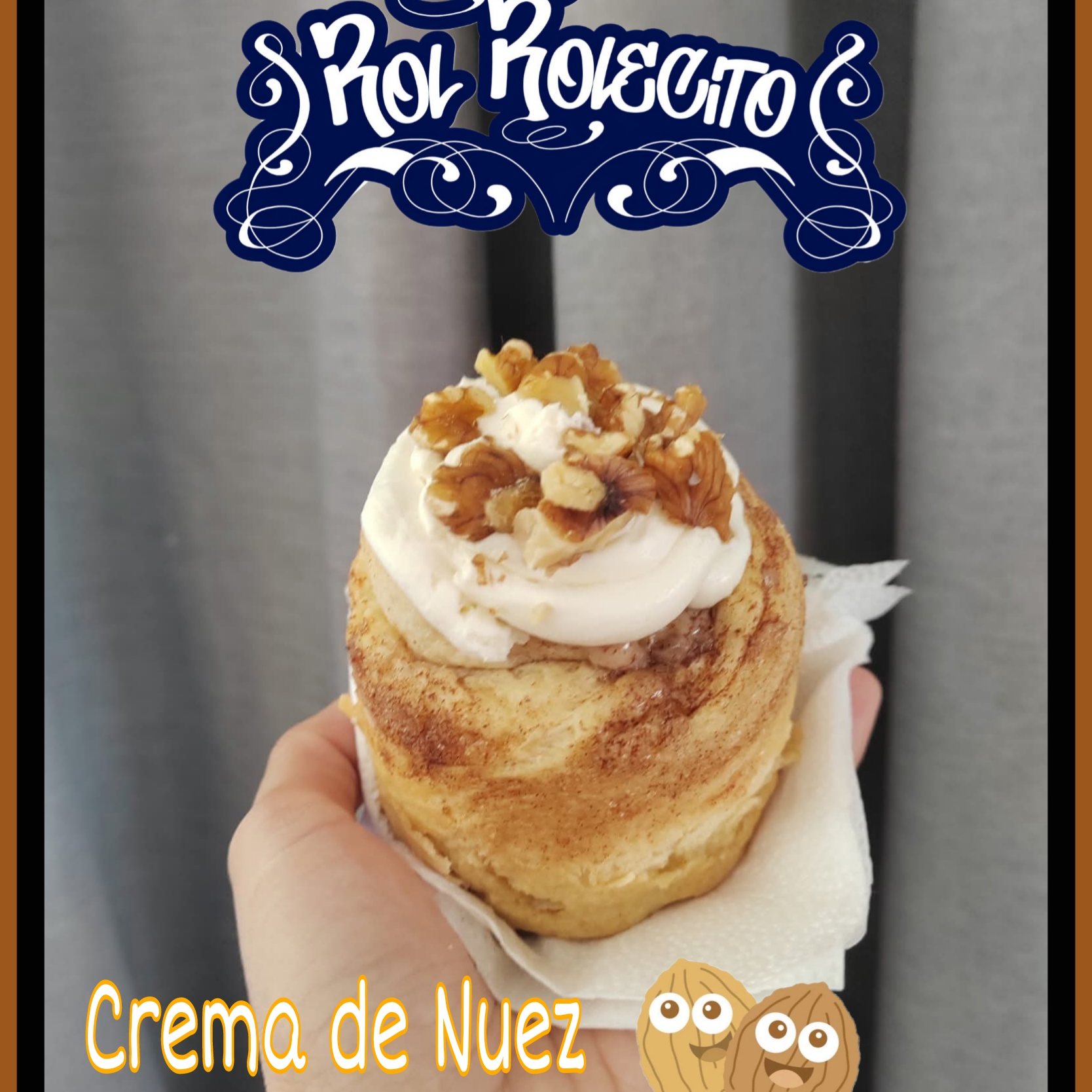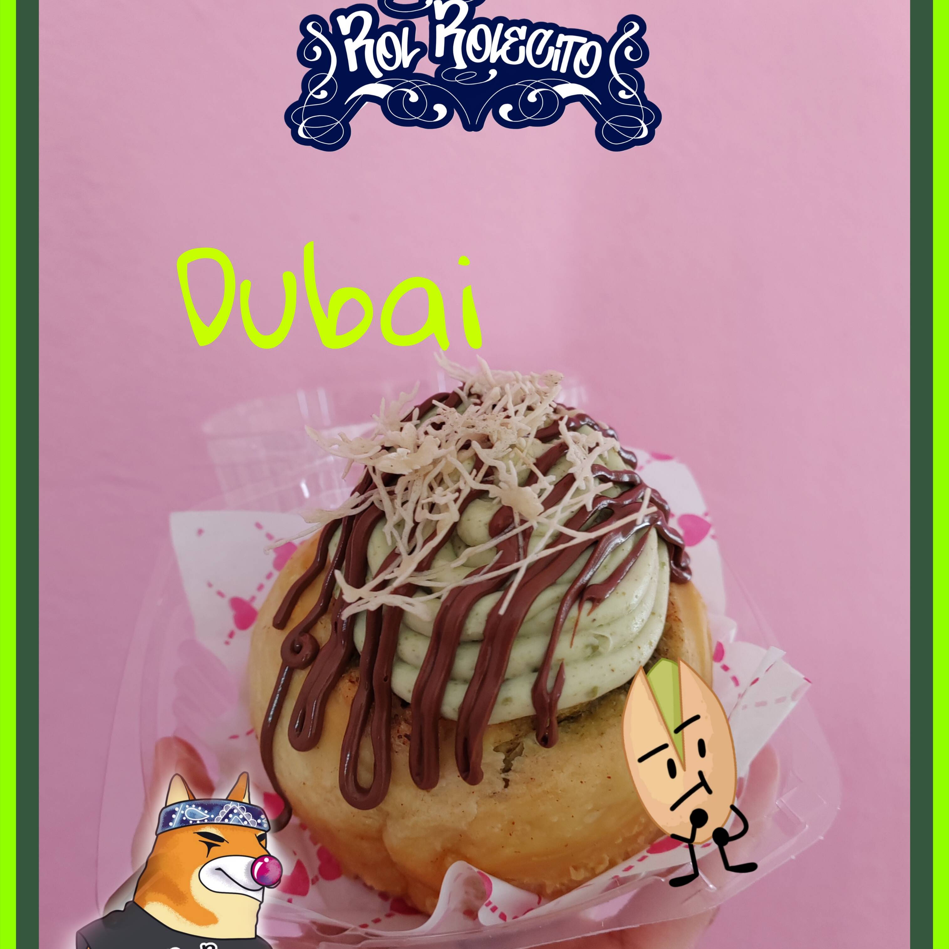 Rol de canela premium estilo Dubái, relleno de pasta de Pistache y chocolate blanco, con nuestra cubierta de queso crema sabor pistache, bañado de Nutella y pasta Kataifi.