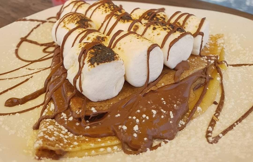 Crepa con salsa de chocolate Hershey's, plátano, fresa, y bola de nieve de vainilla.