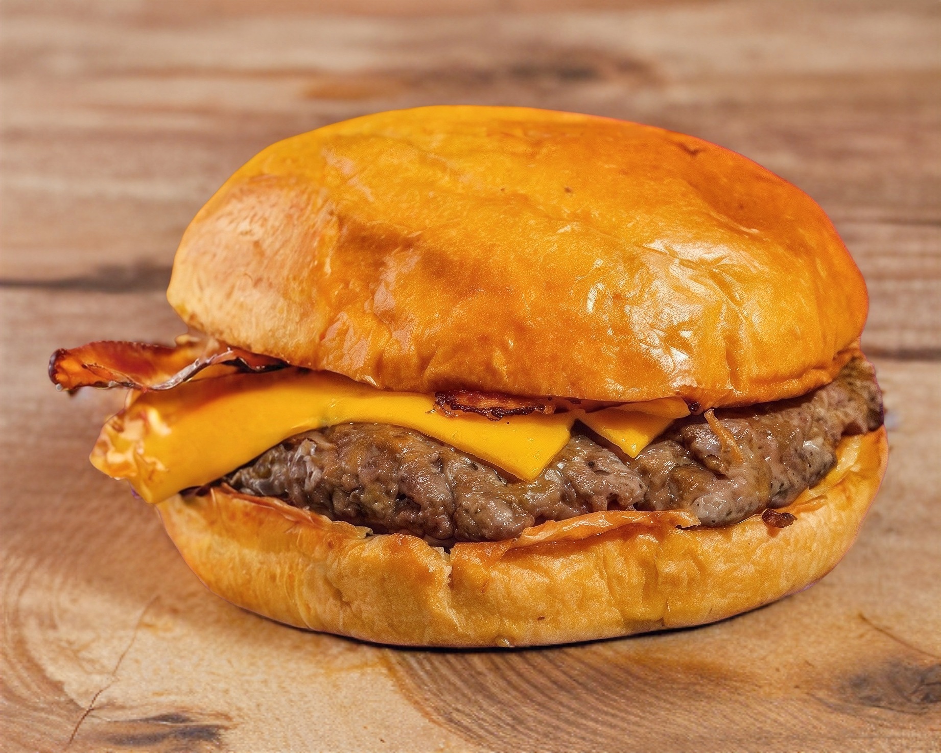 Doble carne de res, queso cheddar gratinado, tocino frito, aderezo chipotle, cebolla caramelizada y papas a la francesa (140 gr).