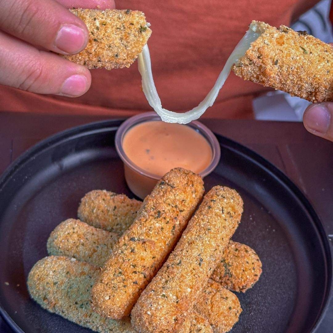 Palitos de queso empanizados acompañados de aderezo buffalo ranch.