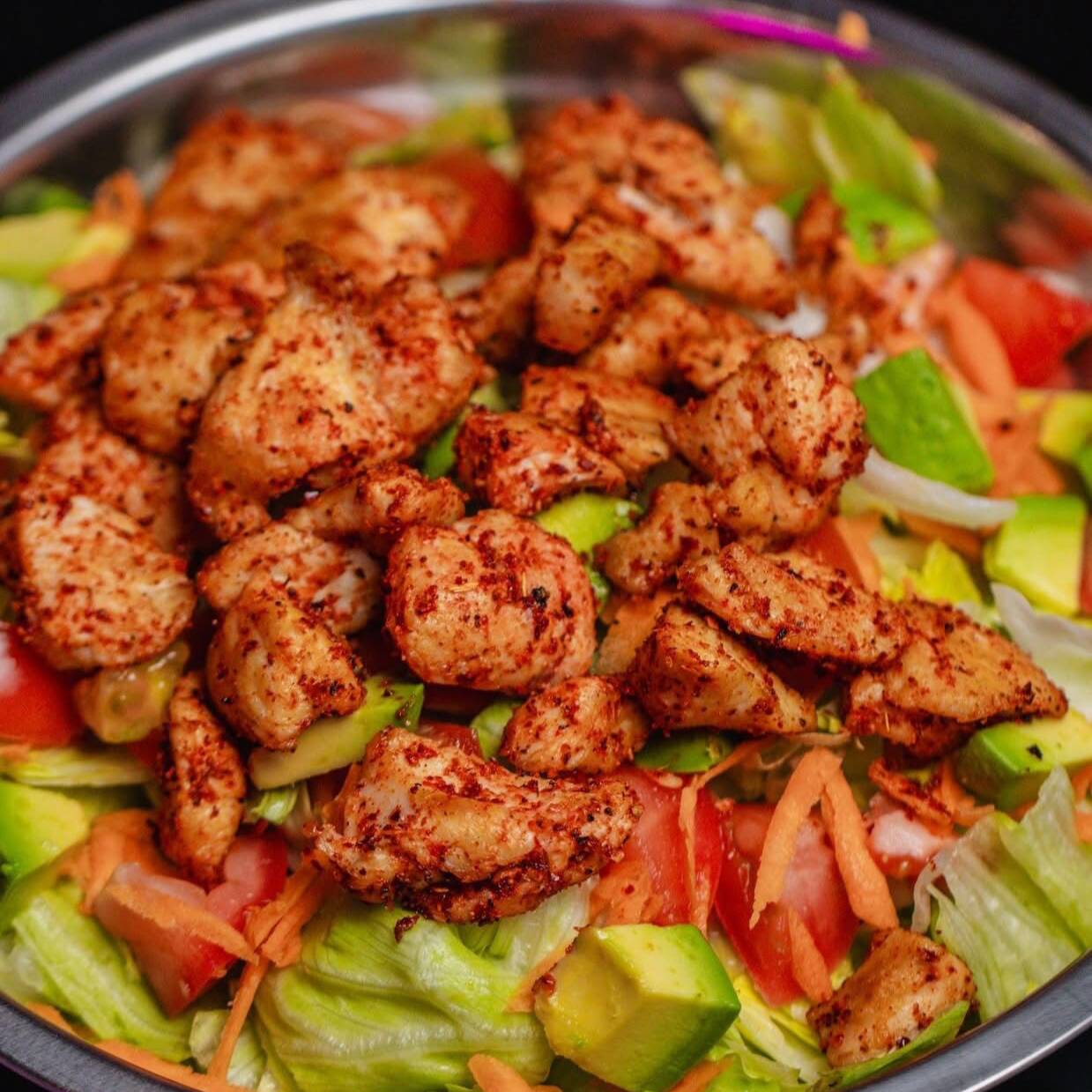 Ensalada Spicy personal, Lechuga romana, cubos de aguacate, zanahorita rallada, tomate, aderezo jalapeño y pechuga de pollo (150 gr) bañada con salsa Tajín .