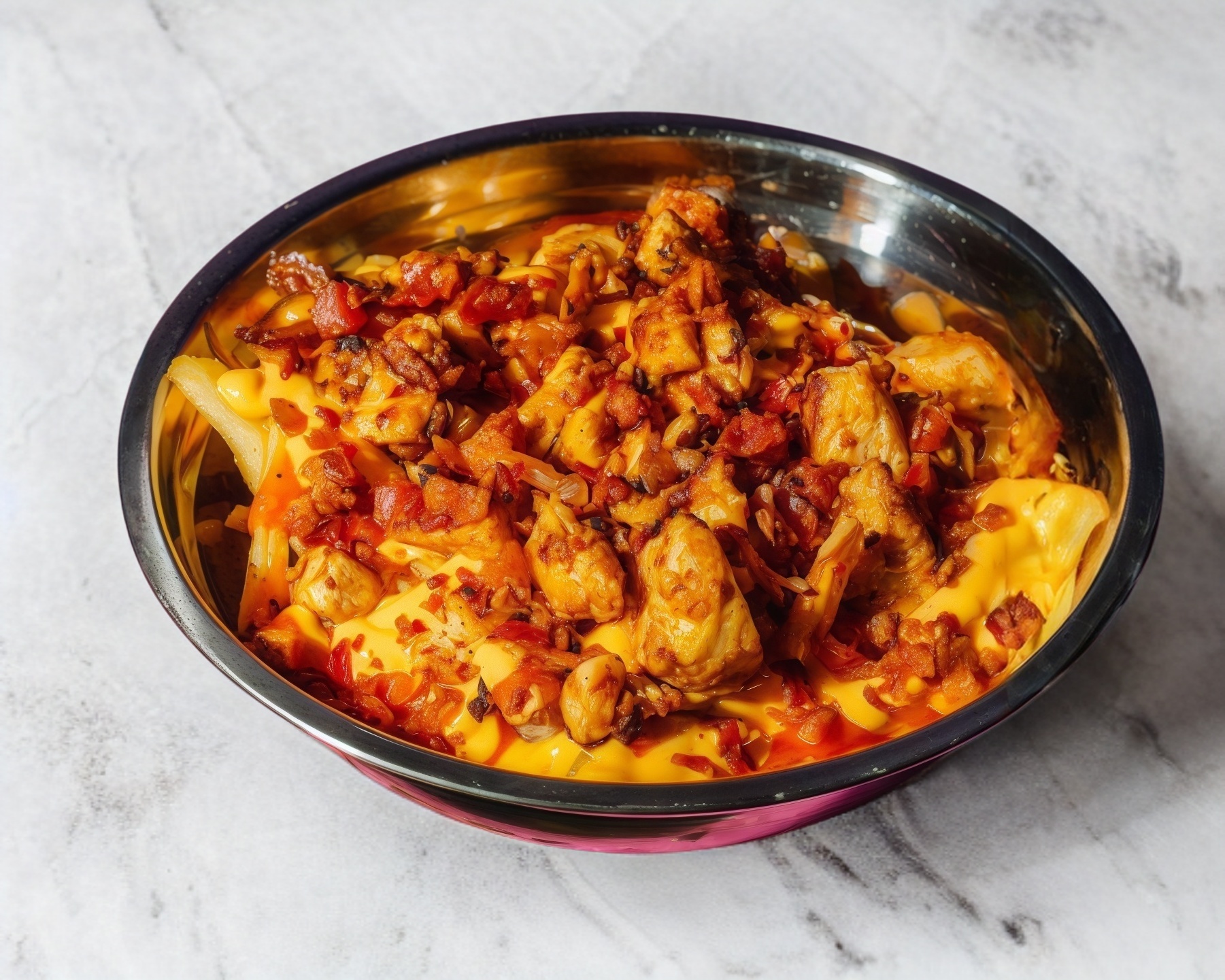 Papas fritas corte recto bañadas en queso cheddar y salsa buffalo, acompañadas de tocino frito y pechuga de pollo grill.