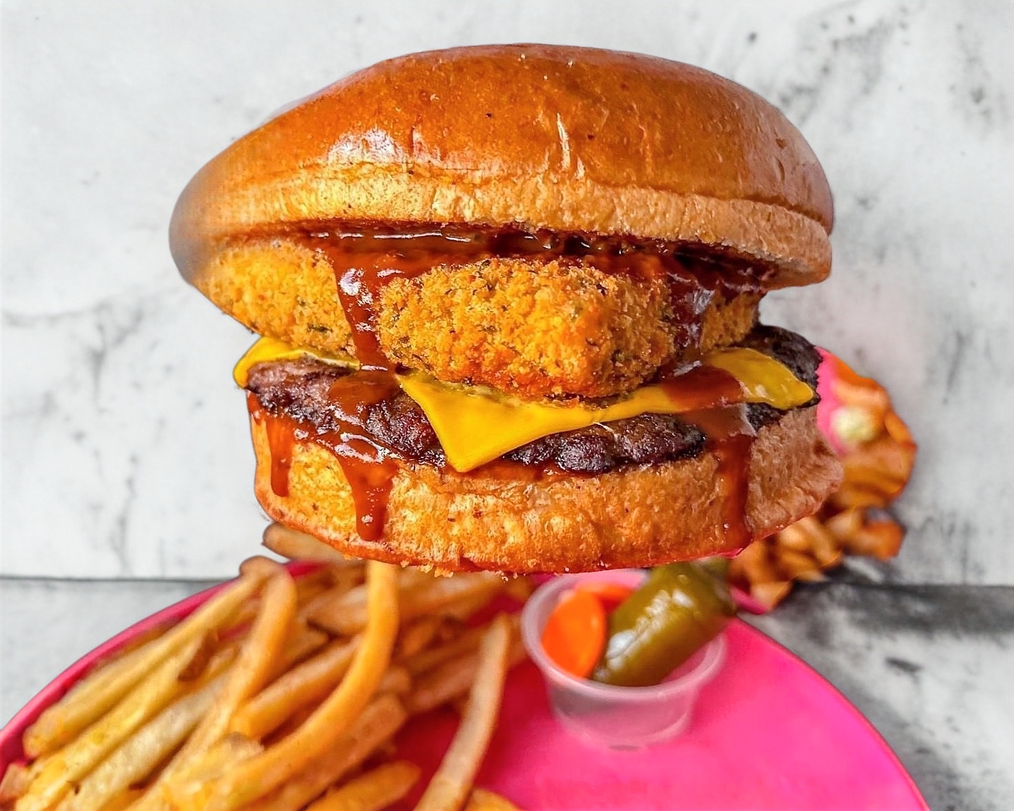 Carne de res, queso cheddar gratinado, queso mozarella empanizado y aderezo BBQ chipotle.