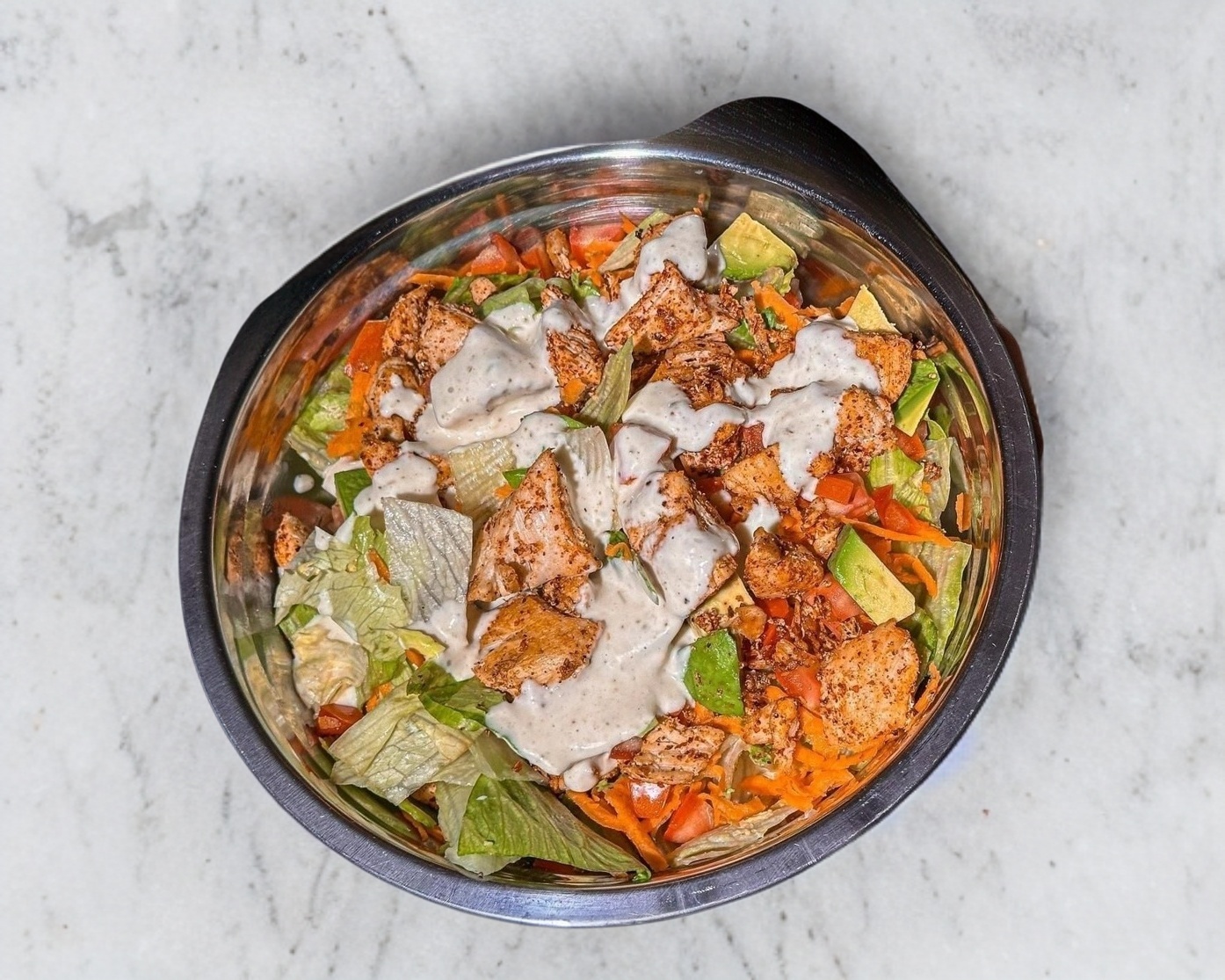 Mezcla de lechugas frescas, zanahoria rallada, fritura de tortilla, aguacate, aderezo ranch, lemon pepper y pechuga marinada en salsa buffalo.