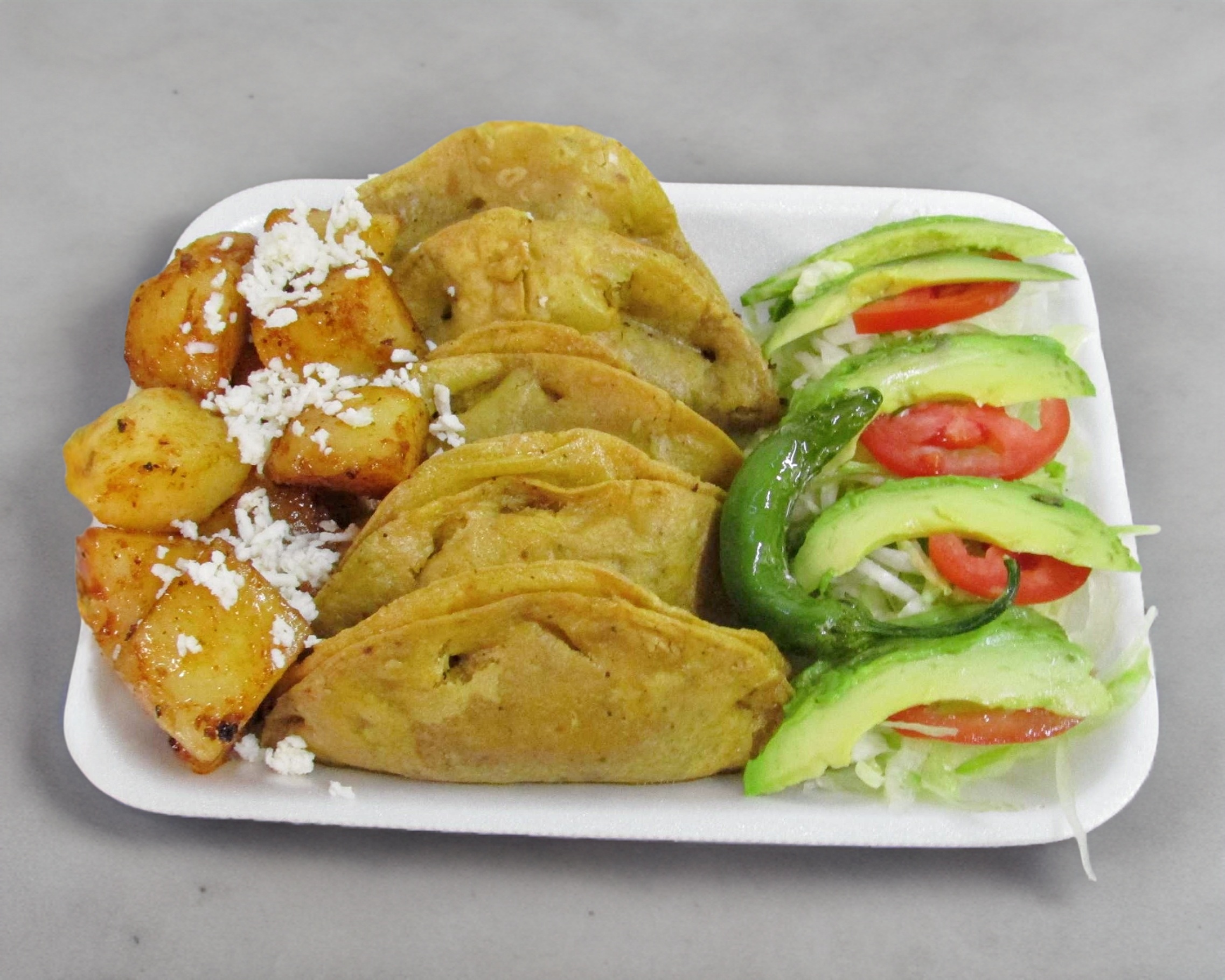 Orden de 5 taquitos dorados llenos con guiso a elegir: Desebrada natural, Chicharron, Frijol y Papa , preparados Suaves o Tostados en Manteca de Puerco según el gusto a elegir, acompañados de ensalada de lechuga y tomate , rebanadas de aguacate, porcion de papas fritas con queso fresco espolvoreado,
