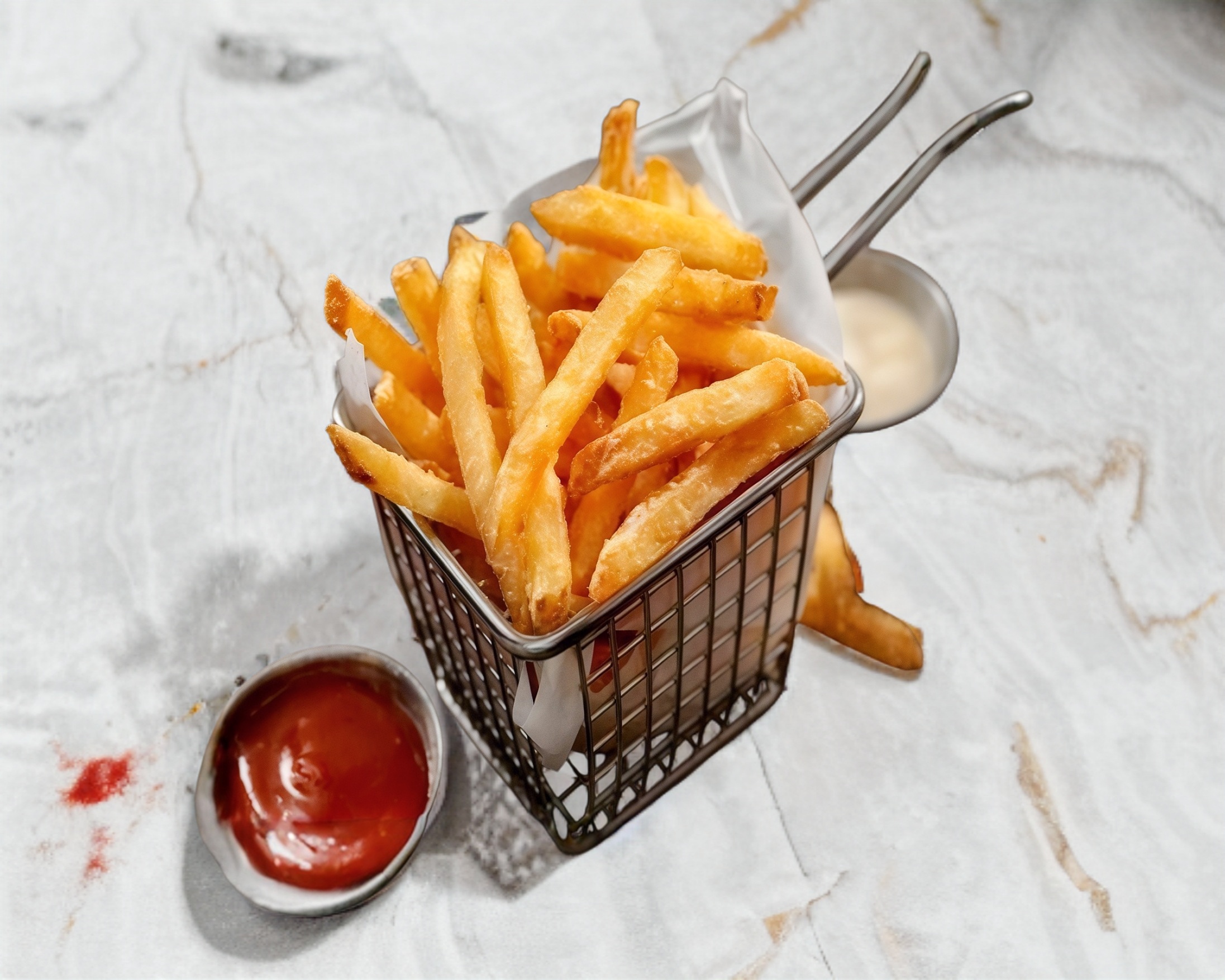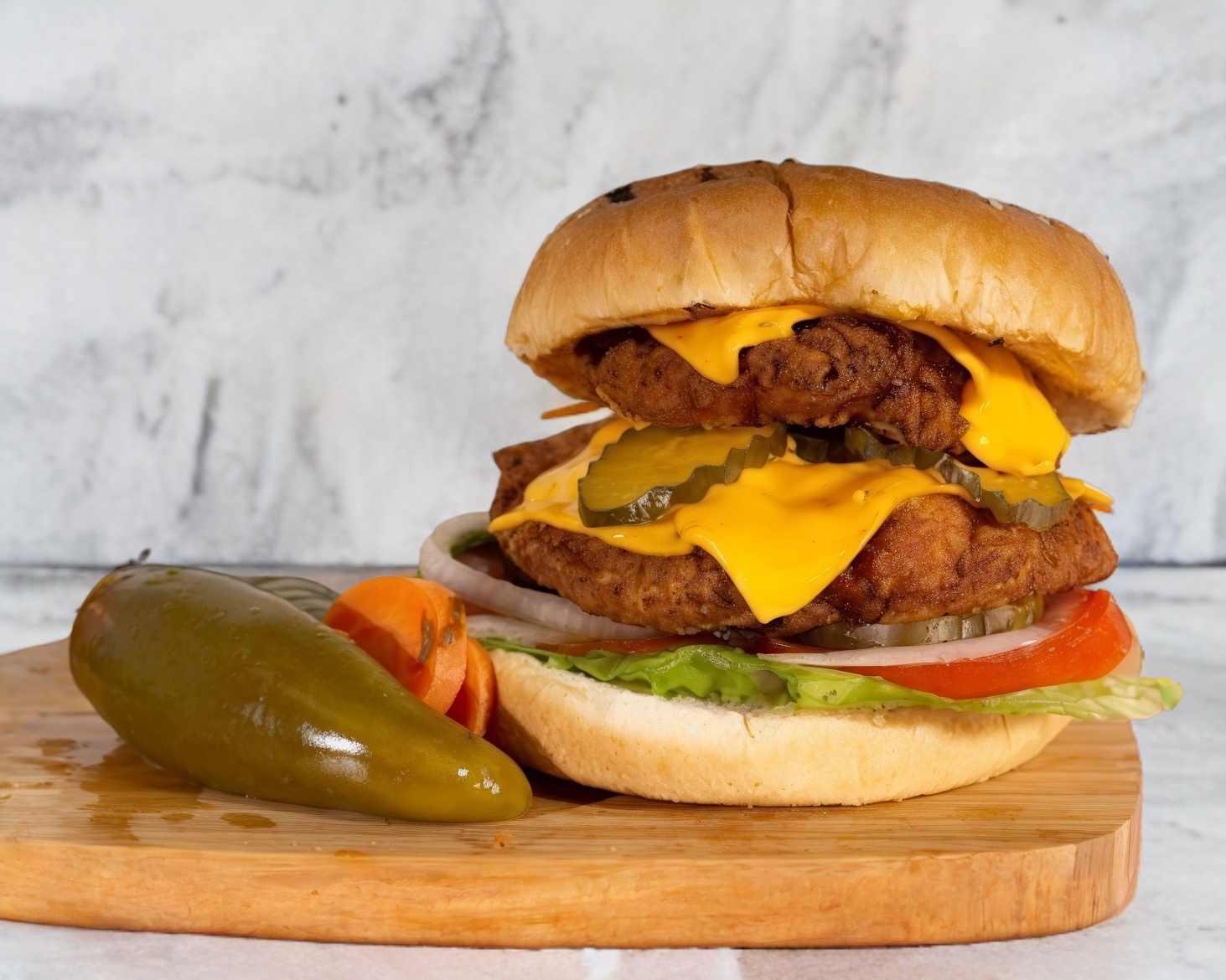 Deliciosa hamburguesa con doble pechuga empanizada picante, pan, queso americano, tomate, cebolla, mayonesa, cátsup y mostaza.