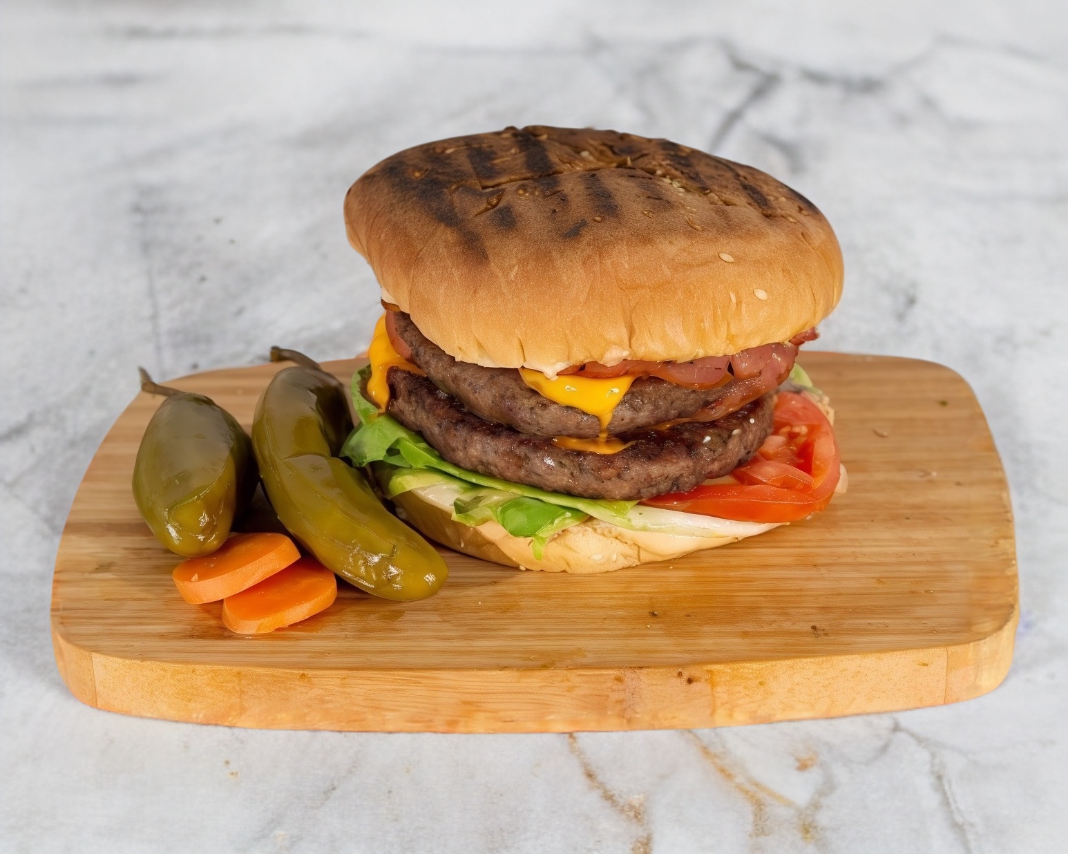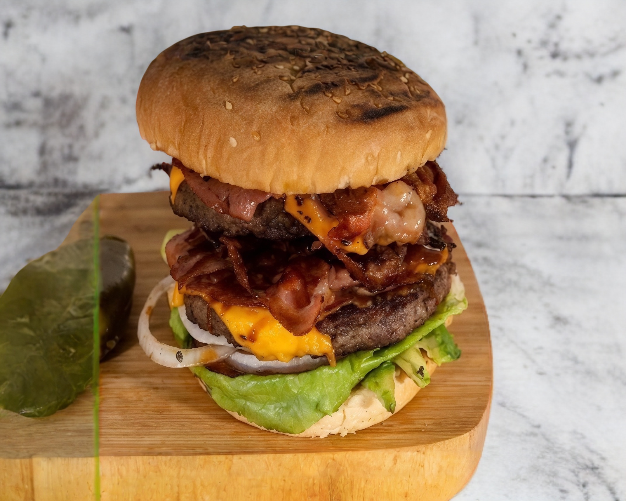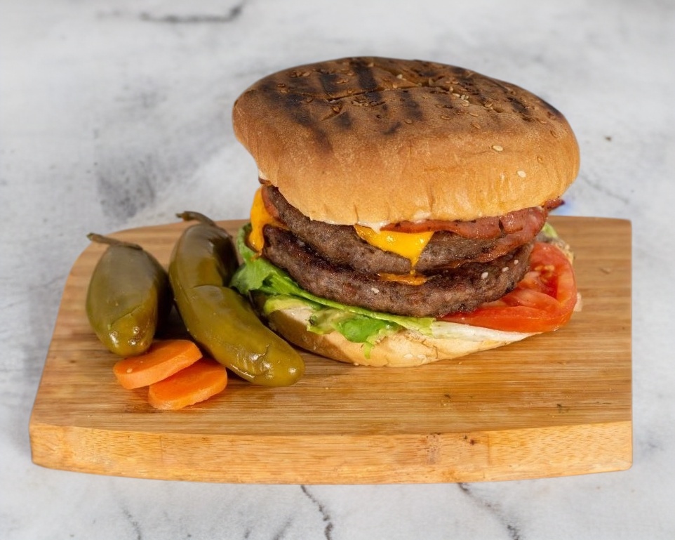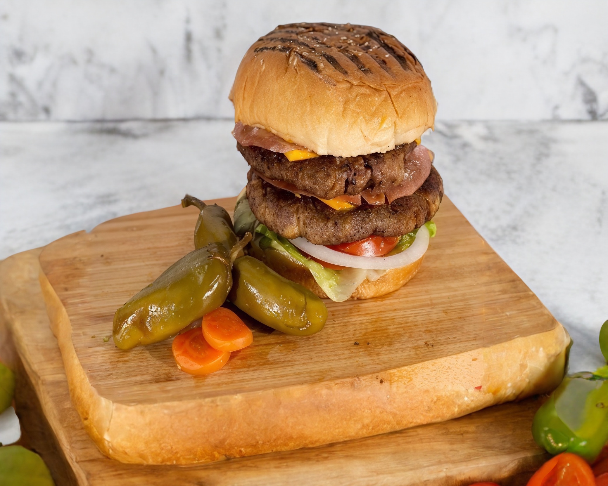 Deliciosa hamburguesa con doble carne artesanal de res, pan, jamón, tocino, aros de cebolla, queso americano, tomate, mayonesa, cátsup, mostaza y BBQ.