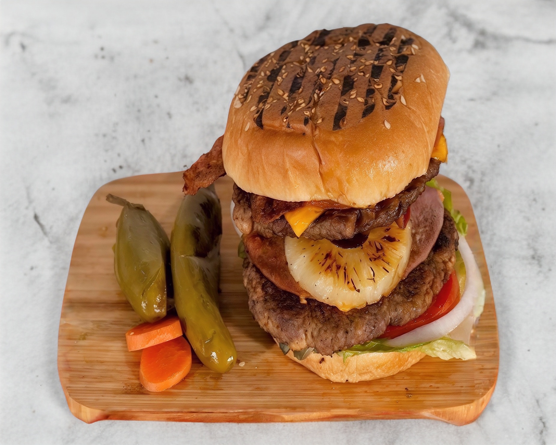 Deliciosa hamburguesa con doble carne artesanal de res, piña, pan, jamón, tocino, queso americano, tomate, cebolla, mayonesa, cátsup y mostaza.