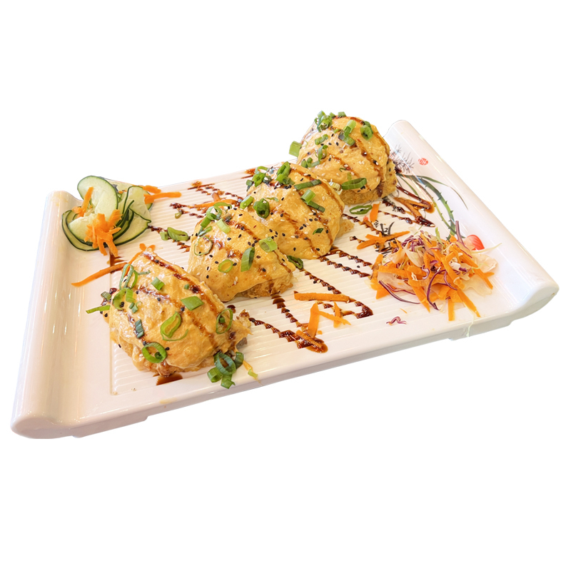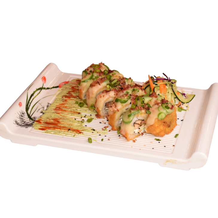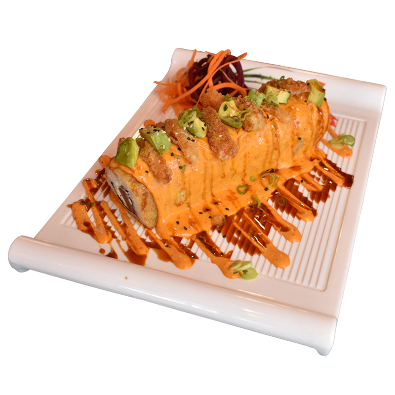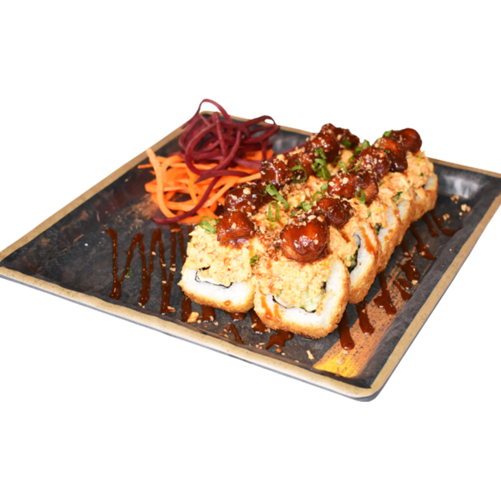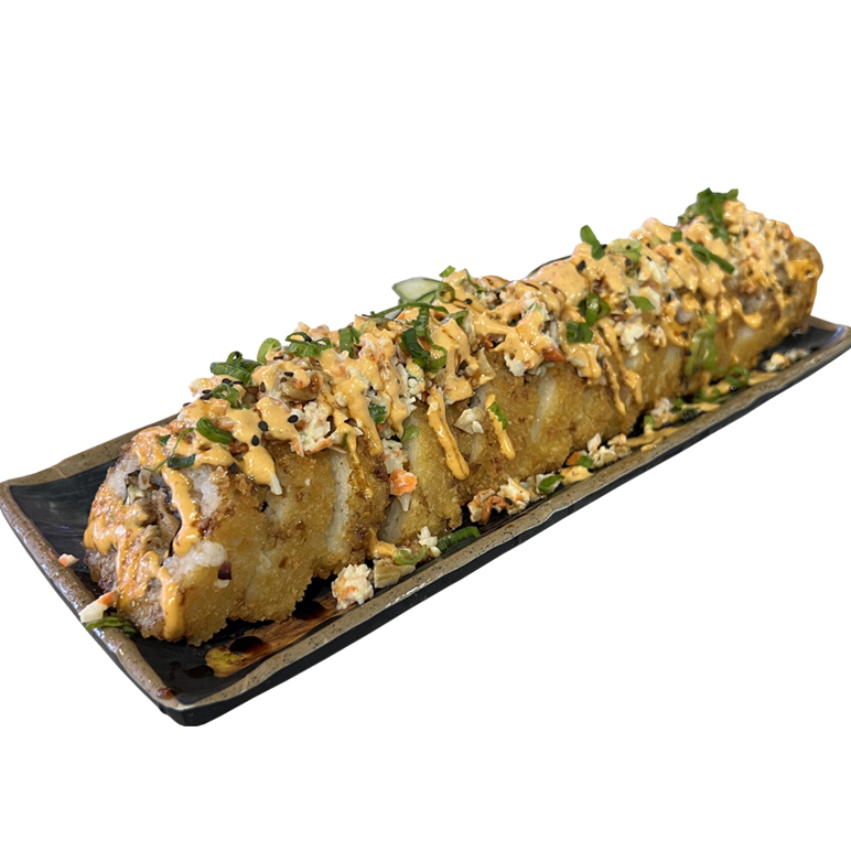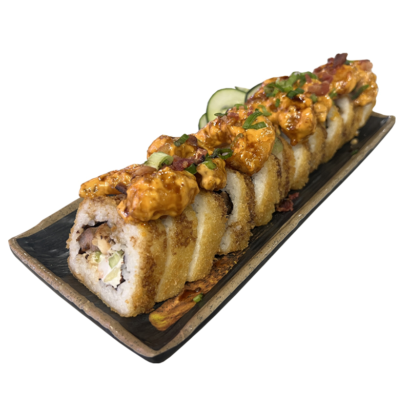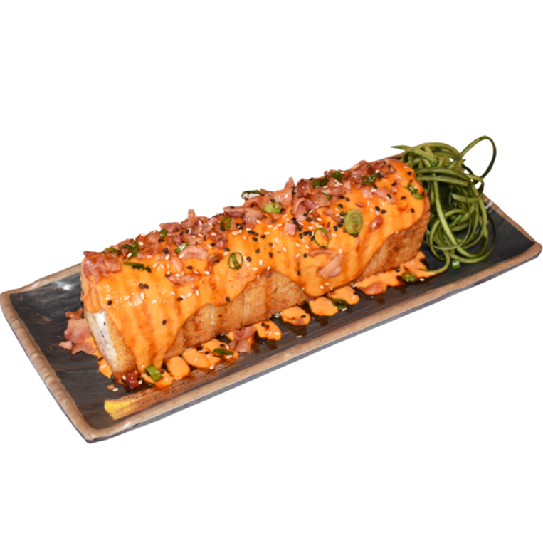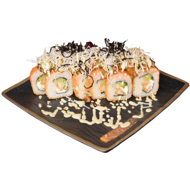 PHILADELPHIA, PEPINO,AGUACATE Y CAMARON EMPANIZADO POR DENTRO CON TOPPING DE TAMPICO SPICY, CORONADO CON TROCITOS DE POLLO EMPANIZADO. BAÑADO CON NUESTRA SALSA CARAMELO SPICY