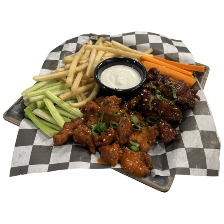 TROZOS DE PECHUGA EMPANIZADAS, ACOMPAÑADOS DE BASTONES DE APIO Y ZANAHORIA , ADEREZO RANCH, PAPAS A LA FRANCESA, BAÑADOS DE SALSA DE SU PREFERENCIA BBQ-BUFALO-MANGO SPICY O MANGO ABANERO