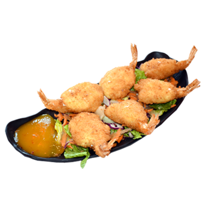 300 GR CAMARON CRUJIENTE BAÑADO EN ADEREZO ESPECIAL DE LA CASA, SERVIDOS SOBRE UNA CAMA DE ENSALDA DE COL BLANCA, COL MORADA Y ZANAHORIA. DECORADO CON CEBOLLIN Y AJONJOLI