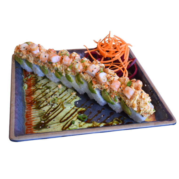 PHILADELPHIA, PEPINO,POLLO, RES Y CAMARON POR DENTRO. FORRADO DE AGUACATE, TOPPING DE TAMPICO SPICY, CORONADO CON TROCITOS DE CAMARON Y CANGREJO EMPANIZADO, BAÑADO EN SALSA DE ANGUILA
