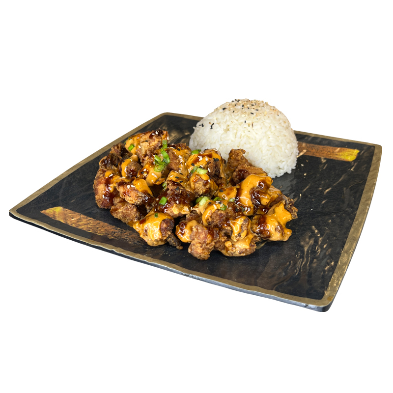 POLLO EMPANIZADO, BAÑADO CON SALSA CHIPOTLE Y SALSA DE LA CASA PICANTE CON PORCION DE ARROZ BLANCO