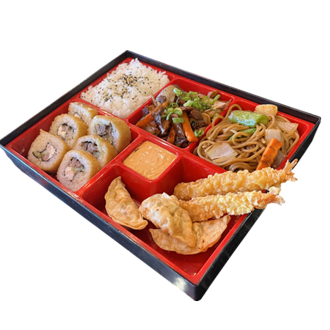1\2 ROLLO DE CIELO MAR Y TIERRA DE LA CASA, 3 DUMPLING, 2 CAMARONES TEMPURA, POLLO TERIYAKI, PORCION DE ARROZ BLANCO Y YAKISOBA