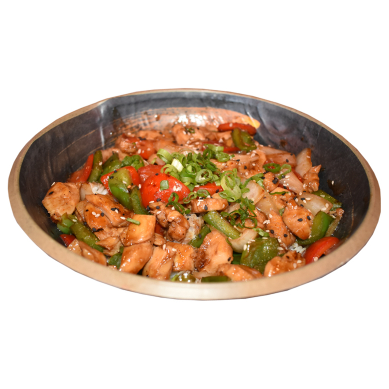 TROZOS DE (POLLO, RES Y CAMARON) SALTEADOS CON CHILE CALIFORNIA, CEBOLLA BLANCA Y ZANAHORIA CON SALSA TERIYAKI DE LA CASA, SERVIDO SOBRE UNA CAMA DE ARROZ BLANCO, LLOVIZNA DE AJONJOLI Y CEBOLLIN