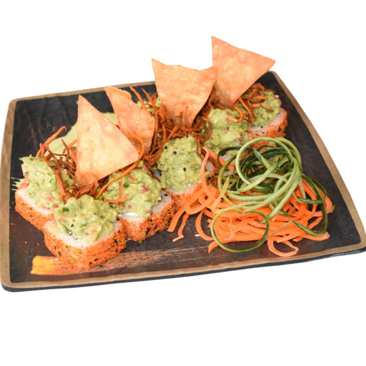 ROLLO A BASE DE PHILADELFIA ,RES,PEPINO Y AGUACATE CON GRATINADO DE QUESO MOSARELA CON CHIPOPTLE DECORADO CON CEBOLLLIN Y AJONJOLI