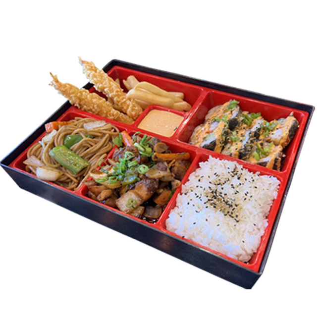 1\2 ROLLO CALIFORNIA DE LA CASA PORCION DE POLLO TERIYAKI, ARROZ BLANCO, SOPA YAKISOBA, PAPAS A LA FRANCESA Y CAMARONES TEMPURA.