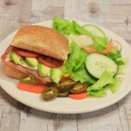 Sándwich de pan integral con jamón de pavo, queso panela. Lechuga, aguacate, tomate. Sobre una cama de lechuga mixta. Acompañado con 1 aderezo a elección y chiles jalapeños