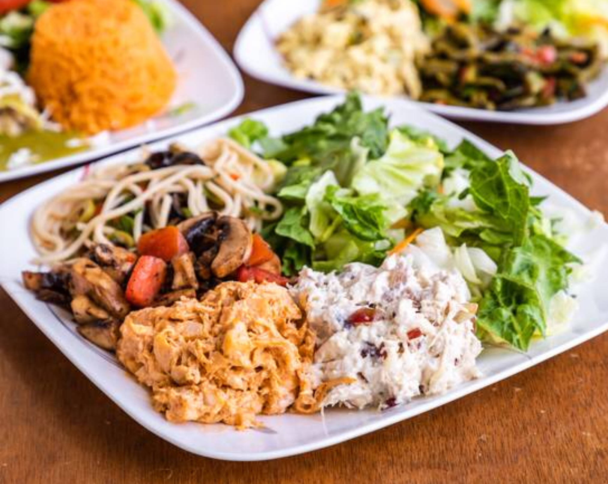 Combinado de 2 ensaladas a tu elección, acompañado con lechuga mixta, galletas saladas, chiles y aderezo