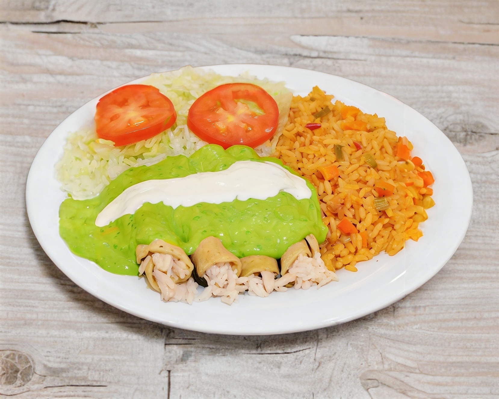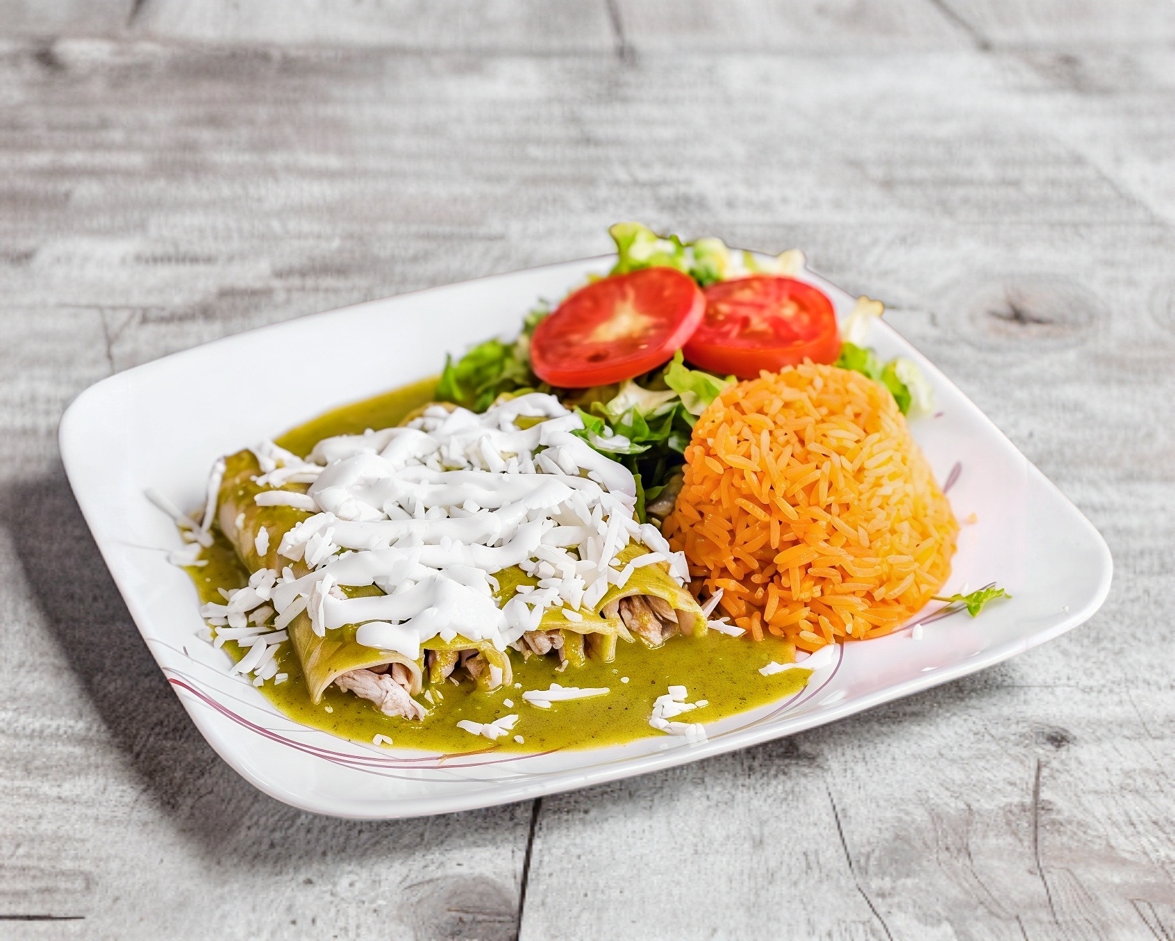 4 Tacos de pechuga o de queso, bañados en salsa de tomate verde (tomatillo) acompañados con arroz, lechuga, tomate.