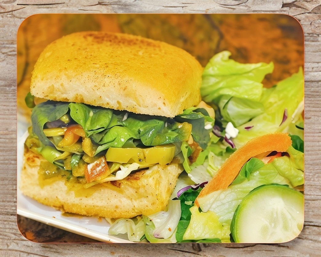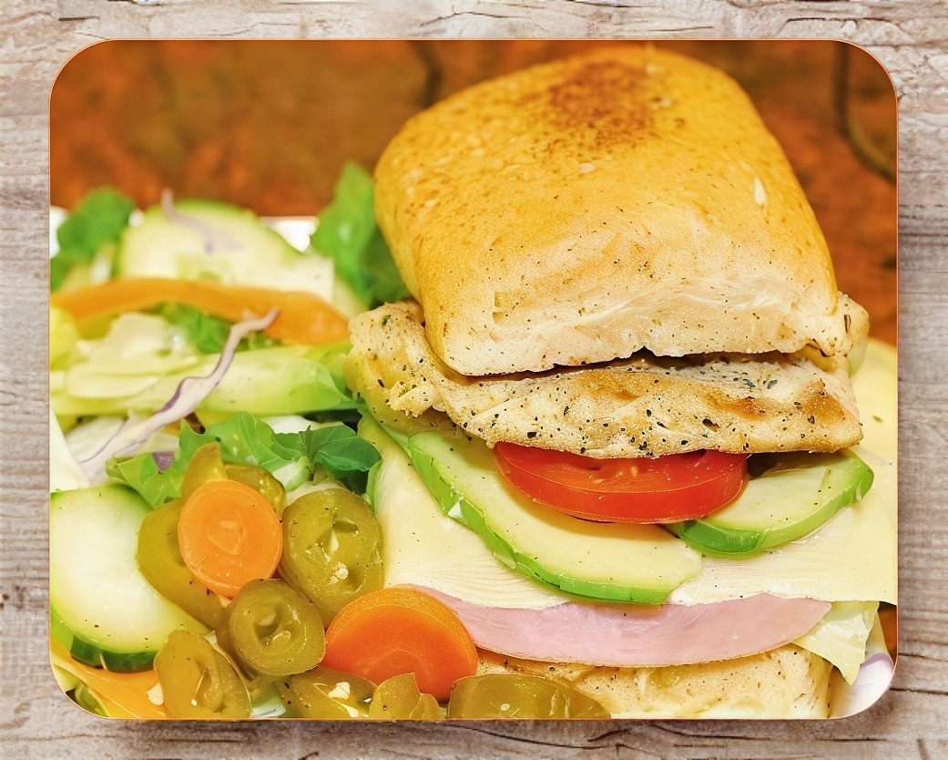 Panini integral con pechuga de pollo a la plancha, jamón de pavo, queso panela, lechuga, tomate y aguacate. Acompañado con 1 aderezo a elección y chiles jalapeños