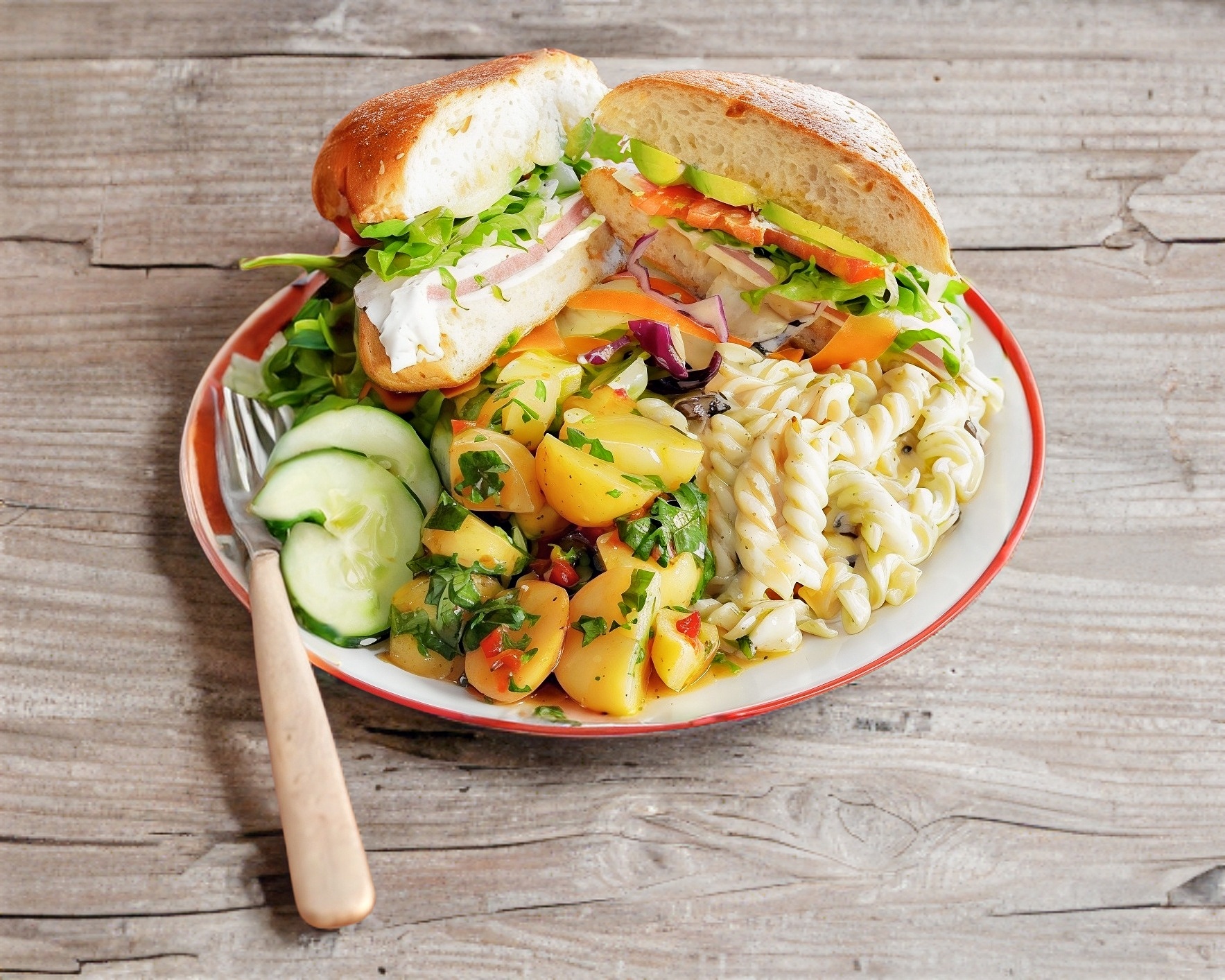 Sándwich de jamón de pavo con ensalada de coditos sobre una cama de lechuga fresca.